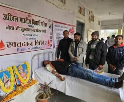 गाजीपुर। अखिल भारतीय विद्यार्थी परिषद गाजीपुर की कार्यकर्ताओं द्वारा नेताजी सुभाष चंद्र बोस के जयंती (पराक्रम दिवस) के अवसर पर गाजीपुर नगर में स्थित पीजी कॉलेज में एल एंड टी के साथ मिलकर रक्तदान शिविर लगाया। अभाविप के पूर्व प्रदेश सह मंत्री कामदेश्वर सिंह ने ज्ञान की देवी मां सरस्वती जी एवं युवाओं के प्रेरणादायक स्त्रोत स्वामी विवेकानंद के चित्र के समक्ष दीप प्रज्वलित कर रक्तदान शिविर प्रारंभ किया। नेताजी के विचारों से प्रभावित होकर शिविर में 50 से अधिक छात्रों ने रजिस्ट्रेशन कराया और 23 यूनिट रक्तदान किया। श्री सिंह ने कहा की विद्यार्थी परिषद समाज में प्रत्येक समस्या के समाधान के लिए काम करता आ रहा है। आगे उन्होंने कहा कि विद्यार्थी परिषद अपने सेवा कार्य के माध्यम से युवाओं को दिशा देने का कार्य कर रहा है। विद्यार्थी परिषद का उद्देश्य है कि समाज का प्रत्येक युवा समाज में हो रहे दूरव्यवस्था को समाप्त करने के लिए आगे आए। श्री सिंह ने कहा कि युवाओं को रक्तदान करने के लिए आगे आना चाहिए क्योंकि हमारे रक्तदान से किसी इंसान की जान बच सकती है। क्योंकि समाज में ऐसे भी लोग हैं जिनको रक्त की बहुत आवश्यकता पड़ती है। इसलिए हम सभी युवाओं को संकल्पित होना। उक्त अवसर पर फार्मासिस्ट संतोष ठाकुर, अंजलिना, विपुल, ईशान, ओमकार, बृजेश, प्रभात, अर्पित शर्मा आदि कार्यकर्ता उपस्थित रहे।