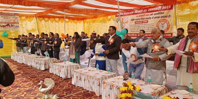 गाजीपुर। भारत निर्वाचन आयोग के निर्देशानुसार 15वॉ राष्ट्रीय मतदाता दिवस का शुभारम्भ पी0जी कालेज गोराबाजार मैदान में जिला निर्वाचन अधिकारी/जिलाधिकारी आर्यका अखौरी ने फीता काटकर, दीप प्रज्ज्वलित एंव मॉ सरस्वती के चित्र पर माल्यापर्ण कर किया। जिलाधिकारी ने उपस्थित छात्र-छात्राओ एवं आगन्तुको को मतदान के प्रति शपत दिलाई। तत्पश्चात मुख्य चुनाव आयुक्त द्वारा 15वें राष्ट्रीय मतदाता दिवस पर दिये गये संदेश को एल ई डी के माध्यम से प्रसारित किया गया। मतदाता को जागरूक करने के उद्देश्य से छात्राओ द्वारा आकर्षक रंगोली, मेहदी व स्लोगन, बनाया गया था जिसका अवलोकन जिलाधिकारी द्वारा स्वयं किया गया इस अवसर पर छात्राओ की निबन्ध प्रतियोगिता भी कराई गयी। जिलाधिकारी एवं अन्य अधिकारियो ने कार्यक्रम स्थल पर बनाये गये शेल्फी प्वाइन्ट पर फोटो खिचवाकर मतदाता जागरूकता हेतु हस्ताक्षर अभियान का शुभारम्भ किया। राष्ट्रीय मतदाता दिवस पर विषय-वस्तु (थीम) वोट जैसा कुछ नहीं, वोट जरूर डालेंगें हम, की आवाज से मतदाताओ को जागरूक किया। इस अवसर पर विभिन्न प्रतियोगिताओ का आयोजन भी किया गया तथा उत्कृष्ट कार्य करने वाले को पुरस्कार एवं प्रमाण पत्र देकर सम्मानित किया गया तथा 18 वर्ष पूर्ण कर चुके नये मतदाताओ को प्रथम बार मतदाता सूची में नाम दर्ज होने पर बधाई देते हुए वोटर आई डी कार्ड दिया गया। जिलाधिकारी ने राजकीय बालिका इण्टर कालेज महुआबाग से स्कूटी रैली को हरी झण्डी दिखाकर रवाना किया। इसके अतिरिक्त रायफल क्लब परिसर से विभिन्न विद्यालयो के छात्र-छात्राओ द्वारा निकाली गयी मतदाता जागरूकता रैली को उप जिला निर्वाचन अधिकारी/अपर जिलाधिकारी वि0रा0 दिनेश कुमार ,जिला विद्यालय निरीक्षक एवं जिला बेसिक शिक्षा अधिकारी ने संयुक्त रूप से हरी झण्डी दिखाकर रवाना किया, जो शहर के विभिन्न मार्गाे से होते हुए पी जी कालेज मैदान (कार्यक्रम स्थल) पर पहुची। रैली के माध्यम से स्कूली छात्र-छात्राओ द्वारा लोगो को मतदान के प्रति गगन भेदी नारो के साथ जागरूक किया गया। जिलाधिकारी ने अपने संबोधन में 15वें राष्ट्रीय मतदाता दिवस की हार्दिक बधाई देते हुए कहा कि भारत विश्व का सबसे बड़ा लोकतंत्र है और इस अधिकार हमने बड़े संघर्ष से प्राप्त किया है, । 26 जनवरी को हम गणतंत्र दिवस मनाते हैं तथा अपने संविधान को स्मरण करते हैं। जिससे हमें सभी अधिकार प्राप्त हैं। उन्होने बताया कि संविधान मे बड़ा अधिकार मतदान का अधिकार है, क्योंकि इसी मताधिकार के क्रम में हम अपना प्रतिनिधि नियुक्त करते हैं । चुना हुआ प्रतिनिधि पॉलिसी बनाते हैं उसी में उत्तर प्रदेश की व्यवस्था चलती है । इस व्यवस्था में हमारे सभी अधिकार सृजित होते हैं । इसलिए हमारा कर्तव्य भी 