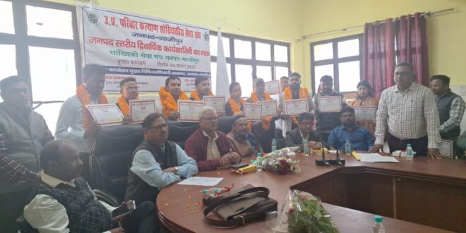 ग़ाज़ीपुर। उत्तर प्रदेश परिवार कल्याण सांख्यिकी सेवा संघ का वार्षिक चुनाव मुख्य चिकित्सा अधिकारी कार्यालय के सभागार में आयोजित किया गया। जिसमें सर्वसम्मति से जयप्रकाश सिंह को अध्यक्ष और दीपक सिंह को महामंत्री पद के लिए नामित किया गया। जिसे सभी कर्मचारियों ने अपना समर्थन दिया। वही नई कार्यकारिणी की भी घोषणा किया गया। गाजीपुर जनपद में उत्तर प्रदेश परिवार कल्याण सांख्यिकी सेवा संघ जो पिछले कई सालों से संचालित हो रहा था। लेकिन पिछले काफी दिनों से सदस्यों की कमी के कारण उदय भान सिंह के देखरेख में धीमी गति से चल रहा था। लेकिन शासन के द्वारा पिछले दिनों जनपद में करीब 16 शोध अधिकारी की नियुक्ति के बाद अब यह संगठन एक बार फिर से एक्टिव मोड में आ गया है। आज का चुनावी प्रक्रिया में एनएचएम प्रभारी डॉ मनोज सिंह, डॉ जे एन सिंह, डॉ शिशिर शैलेश के साथ ही अन्य लोग भी मौजूद रहे। आज के इस चुनावी प्रक्रिया में जयप्रकाश सिंह यादव अध्यक्ष, दीपक सिंह महामंत्री, पूजा सिंह वरिष्ठ उपाध्यक्ष ,अनुराग रघुवंशी उपाध्यक्ष ,मुनाजिर संयुक्त मंत्री ,योगेंद्र सिंह कोषाध्यक्ष और वैभव कुमार को ऑडिटर पद पर मनोनीत किया गये। वहीं उदय भान सिंह और निरंजन प्रसाद चौधरी संरक्षक के रूप में संगठन के लिए कार्य करते रहेंगे। सभी पदाधिकारी को सदस्यों ने माला पहनकर तो वहीं एसीएमओ डॉ जे एन सिंह ने सभी को प्रमाण पत्र देकर उनके उज्जवल भविष्य की भी कामना किया। इसके अलावा कार्यकारिणी सदस्यों की भी घोषणा की गई। कार्यक्रम का संचालन आलोक राय ने किया वहीं नवनियुक्त जिला अध्यक्ष जयप्रकाश सिंह ने सभी का आभार जताया। कार्यक्रम में जिला मलेरिया अधिकारी मनोज कुमार, कुष्ठ रोग प्रभारी डॉ रामकुमार, राघवेंद्र सिंह, रवि शंकर, इशांक श्रीवास्तव के साथ ही अन्य स्वास्थ कर्मी भी मौजूद रहे लोग मौजूद रहे।
