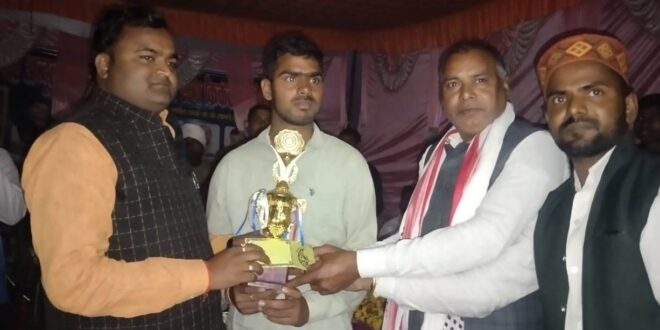 गाजीपुर। दुल्लहपुर क्षेत्र के धामूपुर (चौहान चौक) के सामने शहीद वीर अब्दुल हमीद अंडर आर्म ग्राम सभा किर्केट प्रतियोगिता 2025 मैच का फाइनल मैच खेला गया। जिसमें खिताबी मुकाबला आशीष एलेवन ( रामपुर) क्लब vs संस्कृति इलेवन ( चुरामनपुर) के बीच खेला गया जिसमें मुकाबले में आशीष इलेवन (रामपुर)के सामने संस्कृति एलेवन की टीम 4 ओवर में 4 विकट के बाद 25 रन का लक्ष्य रखा जिसके बाद आशीष एलेवन की टीम 2 ओवर में बिना विकेट गिराए 26 रन बनाकर लक्ष्य को प्राप्त कर लिया। उपविजेता संस्कृति इलेवन चुरामनपुर की टीम रही। जिसमें मैन ऑफ मैच आशिष यादव दीवाल घड़ी मिली विजेता टीम खिलाड़ी अभिजीत ,अतुल, मिथिलेश ,अभिषेक, संदीप, अभय आलोक , उपविजेता खिलाड़ी टीम संस्कृति एलेवन (चुरामनपुर) मैन ऑफ सीरीज शिब्बू कुमार जूता दिया गया टीम, दुरविजय, अर्जुन, कमलेश, श्री, रौशन, सचिन , साहब, आदि खिलाड़ी थे। जिसमें प्रथम विजेता को 4000 रुपये मेडल, कप दिया गया, उपविजेता को 2500 रुपये, मेडल,कप दिया गया था, मैच ऑफ द सीरीज सेगा जूता थे, जिसमें आयोजक समाजसेवी अनिकेत चौहान कमेटी राजन, अमित,चन्दन ,विष्णु, पिंकू, रविन्द्र, गोविंद, रामलाल ,जितेंद्र चौहान आदि। इस अवसर पर मैच समापन समारोह के मुख्य अतिथि डॉ अनिल यादव जी अर्श पब्लिक स्कूल के प्रबन्धक साथ में बृजेश मौर्या माँ शारदा चिल्ड्रेन स्कूल के प्रबन्धक (धामूपुर वर्तमान ग्राम प्रधान) डॉ सिकानु राम जी साथ में हरेंद्र यादव जी ब्लॉक शिक्षक संघ के अध्यक्ष और खिलाड़ियों को धन्यवाद दिया।