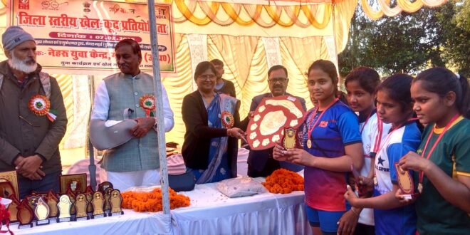 गाज़ीपुर। नेहरु युवा केंद्र गाजीपुर, माय भारत, युवा कार्यक्रम एवं खेल मंत्रालय ,भारत सरकार के तत्वधान में जनपद स्तरीय खेलकूद प्रतियोगिता बुड्ढा हॉस्टल छावनीलाइन में संपन्न हुआ। उद्घाटन समारोह के मुख्य अतिथि अरविंद यादव जिला क्रीड़ा अधिकारी ने कहा कि कोई भी खेल हो खिलाडी को अपनी प्रतिभा के प्रदर्शन के लिए पूरी कोशिश करनी चाहिए तथा नियम संगत खेलना चाहिए ।जब दो टीमें लड़ेगी तो विजय तो एक को ही मिलेगी किंतु इसका तात्पर्य यह नहीं की हारने वाली टीम कमजोर थी। उसे अगली प्रतियोगिता में अपने टीम की कमियों में सुधार कर आगे बढ़ना चाहिए। अध्यक्षीय संबोधन में दिलीप कुमार जिला युवा कल्याण अधिकारी ने कहा कि युवा खेल को दैनिक दिनचर्या में लाए। खेल से उत्तम स्वास्थ की प्राप्ति होती है। समापन समारोह की मुख्य अतिथि नगर पालिका चेयरमैन सरिता अग्रवाल ने खिलाड़ियों को संबोधित करते हुए कहा कि खिलाडी देश की धरोहर है ।वर्तमान परिपेक्ष में जिस प्रकार महिलाएं भी खेल के क्षेत्र में आ रही हैं, निश्चित रूप से माता-पिता में लड़का लड़की के बीच की असमानता की खाई पट रही है। लोग बेटी बचाओ बेटी पढ़ाओ को बढ़ावा दे रहे हैं। उन्होंने खिलाड़ियों को अपने जिले का नाम पूरे देश में प्रतिस्थापित करने का आवाह्न किया। विशिष्ट अतिथि विनोद अग्रवाल पूर्व चेयरमैन नगर पालिका परिषद ने कहा कि खिलाडी धन्य है जो युद्ध के मैदान कोई खेल के मैदान में बदल देते हैं। जब खेलते हैं तो अपने देश के लिए। यह भी राष्ट्र भक्ति है ।जनपद स्तरीय महिला कबड्डी में मरदह की टीम कड़े मुकाबले में मुहम्मदाबाद से जीत दर्ज की। बालीवाल पुरुष बिरनो विजेता तथा मनिहारी विकास खंड उप विजेता रहा। साइकिल दौड़ धीमी 500 मीटर में आरती राजभर बिरनो, सपना यादव मरदह तथा खुशबू मनिहारी ने त्रितीय स्थान प्राप्त किया ।बैडमिंटन महिला प्रतियोगिता में सपना यादव मरदह,आनंदिता यादव मुहम्मदाबाद तथा श्रेया चौहान बिरनो ने तृतीय स्थान प्राप्त किया। 45से 55 किलो वर्ग कुश्ती में अमन मनिहारी विजेता रहे ।इस अवसर पर विजेता उप विजेता तथा तृतीय स्थान प्राप्त खिलाड़ियों को सम्मानित किया गया। अतिथियों का स्वागत नेहरु युवा केंद्र के लेखा एवं कार्यक्रम सहायक सुभाष चंद्र प्रसाद ने किया। संचालन अंगद सिंह यादव ने किया। सभी के प्रति धन्यवाद ज्ञापन नेहरु केंद्र के उप निदेशक कपिल देव ने किया। कार्यक्रम को सफल बनाने में उमेश श्रीवास्तव समाज सेवी ,कालीचरण चौहान, पारसनाथ यादव ,रामाधार यादव अनिकेत चौहान ,मनोज कुमार यादव ,रंजीत प्रजापति, बीएस मौर्य आदि का सहयोग सराहनीय रहा।