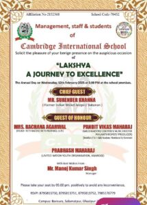 गाजीपुर। ग्रामीण अचंल में स्थित कैम्ब्रिज इंटरनेशनल स्कूल कासिमाबाद का वार्षिक उत्सव बड़े धूमधाम के साथ 12 जनवरी को शाम 5 बजे से मनाया जायेगा। कालेज के प्रबंधक मनोज कुमार सिंह ने बताया कि इस बार वार्षिकोत्सव लक्ष्य ए जर्नी टू एक्सिलेंस की थीम पर मनाया जा रहा है। इसीलिए इस वार्षिकोत्सव के चीफ गेस्ट निरंतर परिश्रम के बदौलत शीर्ष पर आये भारतीय टीम के पूर्व विकेट कीपर और बल्लेबाज सुरिंदर खन्ना होंगे। सुरिंदर खन्ना ने कड़े परिश्रम और संघर्ष के बाद भारतीय टीम और दिल्ली के क्रिकेट टीम में परचम लहराया था। इसके अलावा विशिष्ट अतिथि में रचना अग्रवाल और पंडित विकास महाराज होंगे। प्रभास महाराज की गौरवमयी उपस्थिति होगी। मनोज सिंह ने गाजीपुर के गणमान्य लोगों से आग्रह किया है कि इस कार्यक्रम में अवश्य भाग लें।