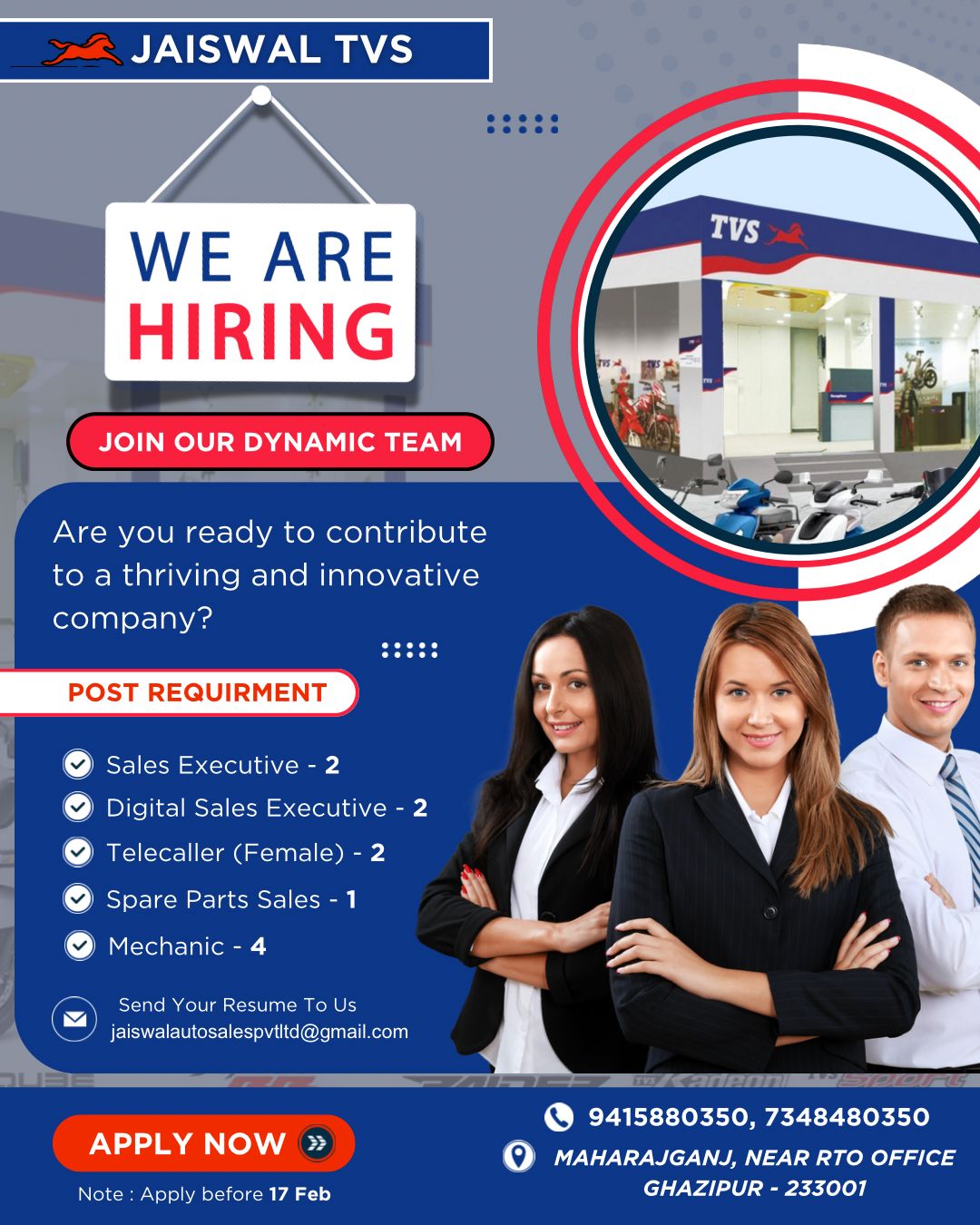 गाज़ीपुर। ऑटोमोबाइल सेक्टर में करियर बनाने की चाह रखने वाले युवाओं के लिए खुशखबरी! जयसवाल TVS ने विभिन्न पदों पर भर्ती की घोषणा की है। कंपनी ने बताया कि यह मौका उन लोगों के लिए है, जो एक सफल करियर बनाना चाहते हैं और ऑटोमोबाइल इंडस्ट्री में प्रगति करना चाहते हैं।
