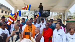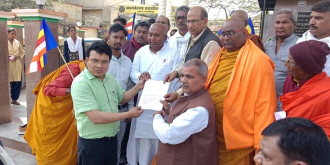 गाजीपुर। बोधगया बिहार के बौद्ध मंदिर पर अवैध रूप से कब्जे को लेकर गाजीपुर में बौद्ध अनुयायियों ने जिला अधिकारी के माध्यम से महामहिम राष्ट्रपति को एक ज्ञापन सोपा ज्ञापन में कहा गया कि 1949 द्वारा भारतीय संविधान के अनुच्छेद 13,14,15,25,26,29,49 और 51 ए का उल्लंघन करके बौद्ध विरासत को बौधों से छीना जा रहा है जिसको बौद्ध अनुयाई बर्दाश्त नहीं करेंगे जल्द से जल्द सरकार इसमें हस्ताक्षर करते हुए मंदिर का पूरा प्रबंध बौद्ध प्रतिनिधियों को सौपे। कार्यक्रम का नेतृत्व कर रहे शील वचन भन्ते ने कहा कि भारतीय संविधान का उल्लंघन करते हुए बौद्ध विरासत पर डकैती करने का प्रयास किया जा रहा है महात्मा गौतम बुद्ध यही ज्ञान प्राप्त किए थे और अशोक महान ने इस मंदिर को बनवाया था परंतु अब यहां पर कथा कथित अाराचक तत्वों का कब्जा हो गया है हम सभी लोगों की मांग है कि यथाशीघ्र पूर्ण रूप से बौद्ध प्रतिनिधियों को बौद्ध विहार की मंदिर को सौंपना चाहिए। कहा कि 23 मई 1953 को तत्कालीन उपराष्ट्रपति डॉक्टर सर्वपल्ली राधाकृष्णन ने बोधगया के मंदिर पर नियंत्रण कर हस्तांतरित कराया था जिस मूल रूप से लागू करना चाहिए कुछ लोग बुद्ध जी की विदेश में प्रशंसा तो करते हैं लेकिन अपने देश में उनका अनादर भी करते हैं यह दोहरी राजनीति नहीं चलेगी और मंदिर का पूरा हक बौद्ध प्रतिनिधियों को मिलना चाहिए। इस कार्यक्रम में मुख्य रूप से भारतीय कांग्रेस पार्टी के पूर्व विधान सभा प्रत्याशी डॉ जनक कुशवाहा,अवधेश कुशवाहा पूर्व जिला अध्यक्ष जन अधिकार पार्टी गाजीपुर, पूर्व महामंत्री अभिमन्यु कुशवाहा , पूर्व विधान सभा अध्यक्ष मरज़द कुशवाहा , बृजेश कुशवाहा जंगीपुर ,विधानसभा संगठन मंत्री ज्योति भारती ,मुन्नी कुमारी ,लालसा कुशवाहा ,डॉक्टर प्रिया मोर्य ,इंदु कुमारी ,लाली देवी ,प्रेमशिला निर्मला ,देवी भगवती सुघरी, देवी शर्मिला प्रजापति ,उर्मिला देवी, राम अवध बौद्ध पूर्व जिला महासचिव जन अधिकार पार्टी गाजीपुर शत्रुघ्न कुशवाहा, सूर्यकांत कुशवाहा ,राजेश प्रेमनाथ ,चंदन कुशवाहा विपिन कुशवाहा विपिन सिंह शेखपुर चंदा जी, प्रेम नाथ गुप्ता, भंते वीरभद्र ,भंते बुद्ध प्रिया, सुनील कुमार सिंह ,डीपीएस कुशवाहा, मनु कुशवाहा ,गणपत कुशवाहा ,रामदास, गयासुद्दीन अंसारी देवेंद्र सिंह शहीद तमाम लोग उपस्थित रहे।