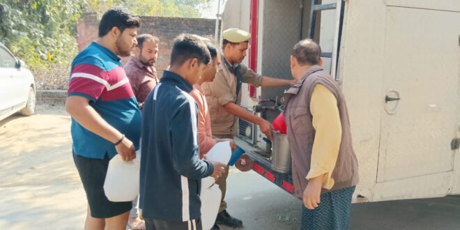 गाजीपुर। महाकुंभ 2025 के समापन उपरांत सरकार की मंशा के अनुसार महाकुंभ से प्रयागराज संगम का पवित्र गंगाजल गाजीपुर भिजवाया गया था। जिसे आज दिनांक 06.03.2025 को प्रतिसार निरीक्षक पुलिस लाइन्स एवं फायर सर्विस के जवानों के द्वारा बड़ा महादेवा एवं जज आवास कॉलोनी में श्रद्धालुओं में वितरित किया गया। महाकुंभ में लगभग 66 करोड़ से अधिक श्रद्धालुओं ने आस्था की डुबकी लगाई, करोड़ों लोग किसी ना किसी वजह से महाकुंभ में स्नान करने से वंचित रह गए ऐसे में सरकार ने लोगों को गंगाजल से स्नान करने और पुण्य लाभ प्राप्त करने के लिए अलग-अलग जिले में फायर ब्रिगेड की गाड़ी से गंगा जल भेजा गया है, इसमें ही जनपद गाजीपुर से महाकुंभ में ड्यूटी पर गई फायर ब्रिगेड की गाड़ी में महाकुंभ का लगभग 2500 लीटर गंगाजल भेजा गया। जिसका लगातार शहर के विभिन्न स्थानों पर अधिक से अधिक लोगों के बीच वितरण किया जा रहा है।