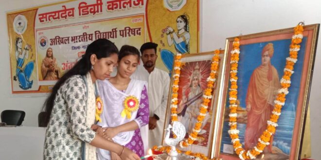 गाजीपुर। अखिल भारतीय विद्यार्थी परिषद् गाजीपुर कार्यकर्ताओ ने अंतर्राष्ट्रीय महिला दिवस के अवसर पर सत्यदेव डिग्री कॉलेज में संगोष्ठी आयोजित किया एवं छात्रा स्थिति सर्वेक्षण अभियान के माध्यम से छात्राओं का सुझाव एकत्रित किया। प्रवासी कार्यकर्ता एस.एफ.एस प्रांत सह संयोजक सुश्री निवेदिता मिश्रा ने कहा कि संपूर्ण संसार में मातृशक्ति पाताल से लेकर आसमान तक की यात्रा शौर्य का परिचय दे रही। जिस प्रकार षडयंत्रकारीयो ने भारत की मातृशक्ति को अबला बताया लेकिन अहिल्याबाई होलकर,रानी लक्ष्मीबाई,जीजाबाई,दुर्गावती आदि जैसे बीरांगनाओ ने अपने शौर्य का परिचय देते हुए यह सिद्ध कर दिया कि भारत की मातृशक्ति अबला नहीं है बल्कि नेतृत्वकर्ता है।कार्यक्रम की अध्यक्ष कर रहे डॉ रोहित सिंह ने कहा कि छात्राओं को अपने शिक्षा के साथ साथ खेलो भारत के माध्यम से नेतृत्व करना चहिए। आगामी दिल्ली में होने वाले छात्रा संसद के निमित्त संगोष्ठी में उपस्थित छात्राओं से छात्र स्थिति सर्वेक्षण अभियान के माध्यम से वर्तमान परिवेश में छात्राओं की स्थिति के बारे में जानकारी एकत्रित किए गया।कार्यक्रम का संचालन ईशान पॉल मोदी ने किया।उक्त अवसर पर विपुल,ईशान,बृजेश,पीयूष और प्रकाश आदि कार्यकर्ता उपस्थित रहे।