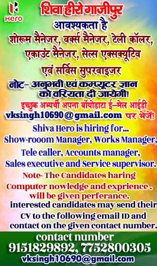 गाजीपुर। भारत की सबसे बड़ी बाइक निर्माता कंपनी हीरो मोटोकार्प के अधिकृत डीलर शिवा हीरो, लंका-चुंगी गाजीपुर के शो-रूम में शो-रूम मैनेजर, वर्क्‍स मैनेजर, टेली कॉलर, एकाउंट मैनेजर, सेल्‍स एक्‍सक्‍यूटिव एवं सर्विस सुपरवाईजर की आवश्‍यकता है। अनुभवी एवं कम्‍प्‍यूटर के जानकारो को वरियता दी जायेगी। इच्‍छुक अभ्‍यर्थी अपना बॉयोडाटा ई-मेल आईडी- vksingh10690@gmail.com पर भेजें। अधिक जानकारी के लिए मोबाईल नंबर- 9151829892 एवं 7752800305 पर सम्‍पर्क करें।