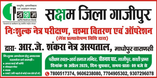 गाजीपुर। सक्षम गाजीपुर की इकाई के द्वारा दिनांक 16 अप्रैल 2025 को आर्य समाज मंदिर चीतनाथ घाट पर वाराणसी के प्रसिद्ध नेत्र चिकित्सालय शंकर नेत्रालय वाराणसी के डॉक्टरो द्वारा निशुल्क नेत्र जांच शिविर का आयोजन किया गया है। शिविर में सुप्रसिद्ध डॉक्टर के द्वारा और उनकी टीम के द्वारा निशुल्क नेत्र जांच, निशुल्क चश्मा वितरण एवं निशुल्क ऑपरेशन होगा। जिन लोगो को अपना नेत्र का परीक्षण कराना है व चश्मा लेना है वे दिनांक 16 अप्रैल 2025 को आर्य समाज मंदिर चीतनाथ घाट गाजीपुर पर प्रातः 9:00 बजे तक उपस्थित होकर उक्त सुविधा का लाभ ले सकते है। यह सुविधा केवल 16 अप्रैल को ही उपलब्ध है।