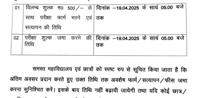 गाजीपुर। वीर बहादुर सिंह पूर्वांचल विश्वविद्यालय, जौनपुर के आदेशानुसार, सम-सेमेस्टर सत्र 2024-25 के लिए स्नातक और स्नातकोत्तर (कला, विज्ञान, वाणिज्य) के संस्थागत / कैरीफॉरवर्ड छात्र-छात्राओं हेतु परीक्षा फॉर्म भरने, सत्यापन करने, और शुल्क जमा करने की अंतिम तिथि को अंतिम अवसर के रूप में 19 अप्रैल 2025, सायं 5:00 बजे तक विस्तारित किया गया है। पी० जी० कालेज, गाजीपुर के प्राचार्य प्रोफ० (डॉ०) राघवेन्द्र कुमार पाण्डेय ने छात्र-छात्राओं को निर्देशित किया है कि इस अंतिम तिथि का कड़ाई से पालन करें।क्योंकि इसके बाद किसी भी परिस्थिति में तिथि विस्तार नहीं किया जाएगा। यदि कोई छात्र इस तिथि तक उक्त औपचारिकताएं पूरी करने में असफल रहता है, तो उसकी सम्पूर्ण जिम्मेदारी स्वयं उनकी होगी।इसलिए सभी छात्र-छात्राएं इस अवसर का लाभ उठाते हुए समय रहते सभी औपचारिकताएं पूर्ण करें, ताकि किसी भी असुविधा से बचा जा सके।
