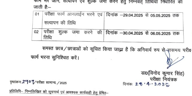 गाजीपुर। वीर बहादुर सिंह पूर्वांचल विश्वविद्यालय, जौनपुर ने सत्र 2019-20, 2021-22 (Non NEP-2020) एवं सत्र 2024-25 की परीक्षाओं हेतु ऑनलाइन परीक्षा फॉर्म भरने, सत्यापन एवं शुल्क जमा करने की प्रक्रिया निर्धारित की है। सत्र 2019-20 अथवा उसके पश्चात प्रवेशित स्नातक (कला, विज्ञान, वाणिज्य), अनिवार्य विषय राष्ट्र गौरव/पर्यावरण (वार्षिक पाठ्यक्रम) तथा स्नातकोत्तर सत्र 2021-22 (Non NEP-2020) में प्रवेशित छात्र-छात्राओं को परीक्षा फॉर्म भरने का अंतिम अवसर प्रदान किया है। इसके लिए ऑनलाइन परीक्षा फॉर्म भरने एवं सत्यापन की तिथि 29 अप्रैल 2025 से 05 मई 2025 तक निर्धारित है। इसी प्रकार, सत्र 2024-25 के संस्थागत / कैरी फॉरवर्ड छात्र-छात्राओं के लिए बी.सी.ए., बी.बी.ए., एल.एल.बी., एल.एल.एम., बी.एड., एम.एड., बी.पी.एड., बी.पी.ई.एस. (सम-सेमेस्टर), पुस्तकालय एवं सूचना विज्ञान, बी.एस.सी. (कृषि) अष्टम सेमेस्टर तथा एम.एस.सी. (कृषि) चतुर्थ सेमेस्टर की परीक्षाओं हेतु ऑनलाइन परीक्षा फॉर्म भरने एवं सत्यापन की तिथि 29 अप्रैल 2025 से 05 मई 2025 निर्धारित की गई है। इस बाबत प्राचार्य प्रोफेसर (डॉ०) राघवेन्द्र कुमार पाण्डेय ने कहा कि सभी छात्र-छात्राओं को निर्देशित किया है कि वे निर्धारित तिथियों के भीतर अनिवार्य रूप से ऑनलाइन परीक्षा फॉर्म भरें और शुल्क जमा करें। निर्धारित समय के पश्चात किसी भी परिस्थिति में फॉर्म स्वीकार नहीं किए जाएंगे। किसी भी तकनीकी सहायता या जानकारी के लिए महाविद्यालय के शुल्क काउंटर संपर्क करें। इस सूचना का गंभीरता से पालन करें और समय रहते आवश्यक कार्रवाई पूर्ण करें।