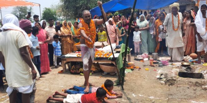 गाजीपुर। देवकली ग्राम पंचायत के अहीरियापर गांव मे श्री काशी दास बाबा( करहा) पूजन नारीपचदेवरा कॆ पुजारी जनार्दन यादव ने पूजन कराया भीषण गर्मी व तेज धूप के बावजूद खुले आसमान के नीचे किया गया जिसमॆ श्रदां व विश्वास के आगे नजर आया।यह पूजन महाभारत कालीन युग से जुङा है।प्रचीन काल से बन शक्ति व गो पूजा की परम्परा चल रही है जो आज भी जारी है।श्री कृष्ण ने इन्द्र की पूजा बन्द करा दी तो इन्द्र कुपित होकर ब्रज को तहस नहस करने के लिए वरूण,पवन,अग्नि को आदेश दिया ।ब्रज मे त्राहि त्राहि मच गयी श्री कृष्ण ने गोवर्धन पर्वत उठाकर ब्रजवासियो की रक्षा कर इन्द्र के घमंड को चकनाचूर कर दिया उसी समय से काशी दास बाबा,मां गंगा,बनशक्ति मां दुर्गा की पूजा का प्रचलन शुरू हुआ।पुजारी जनार्दन बाबा ने पूजा के दॊरान कॆ दॊरान अनेक आश्चर्य जनक करतब दिखाये जिससे लोगो के रोगटें खङे हो गये आस्था व श्रदां भारी पङा।इस अवसर पर कार्यक्रम के आयोजक लालजी कुशवाहा, बुधिराम ,पंचम, सुरेन्दर, राम अचल, अशोक, विरेन्द्र, नरेन्द्र, उमाशंकर, रमाशंकर, विमलेश, जंगबहादुर कुशवाहा सहित काफी संख्या मे श्रदालू भक्त मॊजूद थे।