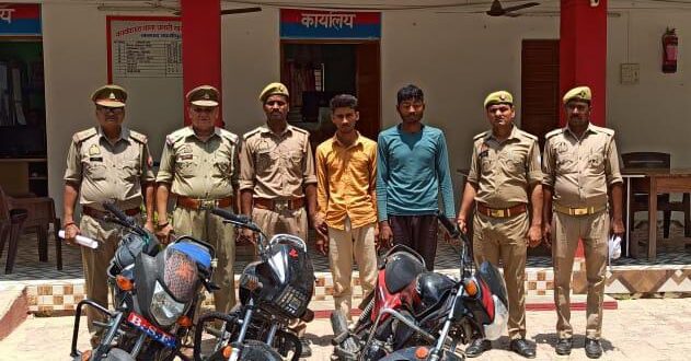 गाजीपुर। थाना क्षेत्र के कटयां चट्टी से बुधवार की अल सुबह पुलिस ने चोरी की तीन बाइकों के साथ दो चोरों को गिरफ्तार करने में सफलता हासिल किया है। दोनों का चालान भेजते हुए पुलिस आगे की कार्रवाई कर रही है। उप निरीक्षक हरिहर प्रसाद मिश्रा और उप निरीक्षक सुरेन्द्र राम मिश्रा हमराहियों संग गश्त पर थे। इसी दरम्यान कटयां चट्टी पर दो संदिग्ध लोग दिखे। पूछताछ में अपना नाम 22 वर्षीय प्रवीण यादव उर्फ छोटू पुत्र अमरनाथ यादव और 19 वर्षीय आशु यादव पुत्र सहादुर यादव निवासीगण आतमपुर छपरा बताया। इनकी निशानदेही पर चोरी की तीन बाइक बरामद किया गया। थानाध्यक्ष बागिश विक्रम सिंह ने बताया कि चालान भेजकर कोर्ट में पेश करते हुए आगे की कार्रवाई की जा रही है।