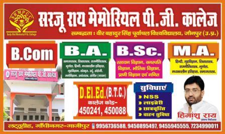 गाजीपुर। वीर बहादुर सिंह पूर्वांचल विश्वविद्यालय जौनपुर से संबद्धता प्राप्त बाराचवर विकास खंड के ग्राम लट्ठूडीह पोस्ट गांधीनगर गाजीपुर में स्थित सरजू राय मेमोरियल पीजी कॉलेज को इस शैक्षणिक सत्र से वाणिज्य संकाय के अंतर्गत बी कॉम की भी मान्यता प्राप्त हुई है। प्रबंध निदेशक हिमांशु राय ने बताया कि क्षेत्र के लोगों की काफी दिनों से मांग थी कि वाणिज्य संकाय के अंतर्गत बी कॉम की भी कक्षाओं का संचालन किया जाए ताकि बच्चों को पढ़ाई के लिए बाहर न जाना पड़े। इसी मांग को पूरा करने हेतु हमने इस वर्ष से बी कॉम की कक्षाओं का भी संचालन प्रारंभ कर दिया है। साथ ही साथ इस वर्ष पूर्व से संचालित एम0 ए0 में भी दो अतिरिक्त विषयों में राजनीति शास्त्र एवं मध्यकालीन इतिहास की कक्षाओं का भी प्रवेश प्रारंभ हो चुका है। महाविद्यालय में पूर्व से ही बा0 ए 0, बी0एस0सी0, एम0 ए0 एवं डीएलएड की कक्षाओं का संचालन होता है एवं सभी कक्षाओं में प्रवेश की प्रक्रिया प्रारंभ की जा चुकी है जो भी छात्र प्रवेश लेने के इच्छुक हैं वह प्रत्येक कार्य दिवस में प्रातः 10:00 बजे से 2:00 बजे के बीच में महाविद्यालय आकर फार्म प्राप्त कर सकते हैं एवं प्रवेश सुनिश्चित कर सकते हैं । उन्होंने यह भी बताया कि शासन द्वारा प्रदान की जाने वाली छात्रवृत्ति एवं टैबलेट और मोबाइल आदि सुविधाएं भी उपलब्ध है।