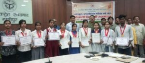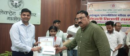गाजीपुर। वर्ष 2025 में हाईस्कूल एवं इण्टरमीडिएट परीक्षा उत्तीर्ण मेधावी विद्यार्थियों को राज्य स्तर पर मुख्यमंत्री योगी आदित्यनाथ उ0प्रदेश सरकार द्वारा लोक भवन, लखनऊ में आयोजित कार्यक्रम में दिनांक-12.06.2025 को सम्मानित किया गया। उक्त कार्यक्रम का लाइव प्रसारण किया गया। इसी क्रम में जनपद गाजीपुर के मेधावी विद्यार्थियों को सम्मानित करने हेतु राईफल क्लब, कलेक्टेªट सभागार गाजीपुर में जिलाधिकारी अविनाश कुमार की अध्यक्षता में कार्यक्रम आयोजित किया गया, जिसमें लोक भवन, लखनऊ में आयोजित कार्यक्रम का विद्यार्थियों एवं अभिभावकों को सजीव प्रसारण को देखा एवं सुना गया। लोक भवन, लखनऊ में आयोजित कार्यक्रम सम्पन्न होने के पश्चात जिलाधिकारी, गाजीपुर तथा माननीय सदस्य विधान परिषद विशाल सिंह चंचल के प्रतिनिधि प्रदीप पाठक द्वारा मेधावी विद्यार्थियों को टेबलेट, पदक एवं प्रशस्ति पत्र प्रदान करते हुए सम्मानित किया गया। जिला विद्यालय निरीक्षक, गाजीपुर द्वारा सभी 20 मेधावी विद्यार्थियों के खाते में 21000.00 000.00 (रु०-इक्कीस हजार मात्र) की धनराशि दिनांक -12.06.2025 को अन्तरित कर दी गयी। जिलाधिकारी एवं विधायक के प्रतिनिधि द्वारा सम्मानित होने वाले मेधावी विद्यार्थियों में कक्षा 10 के 09 छात्राएं एवं 01 छात्र तथा कक्षा-12 के 07 छात्राएं एवं 03 छात्र रहे। जनपद गाजीपुर की 02 छात्राओं ने हाईस्कूल की परीक्षा में राज्य स्तरीय मेरिट सूची में सातवां एवं नौवां स्थान प्राप्त किया है। 68 वीं राष्ट्रीय विद्यालयी खेल प्रतियोगिता 2024-25 में जनपद के पदक विजेता 02 खिलाड़ियों को मुख्यमंत्री विद्यालयी खेल पुरस्कार से सम्मानित किया जाना था। व्यक्तिगत स्पर्धा, एथलेटिक्स अण्डर-19 बालक वर्ग में स्वर्ण पदक विजेता गोलू यादव, बद्रीनाथ इ०का० सहेरी, गाजीपुर को लोक भवन, लखनऊ में आयोजित कार्यक्रम में माननीय मुख्यमंत्री जी करकमलों से प्रशस्ति पत्र, मेडल एवं 75000.00 (रु०-पचहत्तर हजार मात्र) की धनराशि प्रदान की गयी। इसी प्रकार बॉक्सिंग प्रतियोगिता में कांस्य पदक विजेता अमृत गुप्ता, एस०के०बी०एम० इ०का० दिलदारनगर, गाजीपुर को जनपद स्तरीय कार्यक्रम में प्रशस्ति पत्र, मेडल एवं 30000.00 (रू०-तीस हजार मात्र) की धनराशि उनके खाते में अन्तरित कर दी गयी है। अमृत गुप्ता यूथ गेम्स में प्रतिभाग कर रहे है। उनके लौटते ही प्रमाण-पत्र उन्हे प्रदान किया जायेगा। कार्यक्रम का आयोजन जिला विद्यालय निरीक्षक, गाजीपुर द्वारा किया गया। जिलाधिकारी, विधायक प्रतिनिधि एवं जिला विद्यालय निरीक्षक, गाजीपुर द्वारा मेधावी विद्यार्थियों के उज्ज्वल भविष्य की कामना करते हुए प्रेरक संदेश दिये। जिलाधिकारी ने छात्रों से कहा कि भविष्य का लक्ष्य निर्धारित करें, लक्ष्य के प्रति कार्
