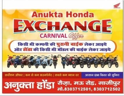 गाजीपुर। भारत के सबसे विश्वसनीय बाइक निर्माता कंपनी होण्डा के शोरुम अनुक्ता होण्डा रौजा-मऊ रोड गाजीपुर ने जिले के बाइक ग्राहकों के लिए एक्सचेंज कार्निवाल ऑफर का ऐलान किया है। इस संदर्भ में अनुक्ता होण्डा के प्रोपराइटर राहुल राय ने बताया कि अनुक्ता होण्डा एक्सचेंज कार्निवाल आफर स्कीम के तहत किसी भी कंपनी की पुरानी बाइक ले आइये और होण्डा की किसी भी मॉडल की बाइक ले जाइये। उन्होने बताया कि अनुक्ता होण्डा में बाइक ग्राहकों के लिए फाइनेंस सुविधा कम ब्याज पर उपलब्ध है। इसमे कम डाउन पेमेंट पर बाइक फाइनेंस हो जायेगी। अधिक जानकारी के लिए मोबाइल नम्बर 8303712501, 8303712502 पर संपर्क करें।