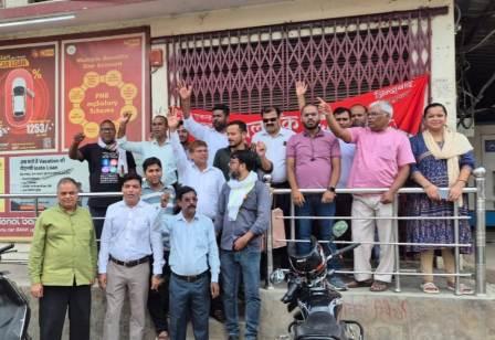 गाज़ीपुर। केंद्र सरकार की जनविरोधी आर्थिक नीतियों और श्रमिक-विरोधी श्रम सुधारों के खिलाफ बुधवार को आयोजित राष्ट्रव्यापी हड़ताल में गाज़ीपुर के बैंक कर्मचारियों ने बढ़-चढ़कर हिस्सा लिया। पंजाब नेशनल बैंक शाखा पर कर्मचारियों ने प्रदर्शन कर नारेबाजी के साथ विरोध दर्ज कराया। कर्मचारियों ने सरकार की निजीकरण, विनिवेश और ठेका प्रथा को बढ़ावा देने वाली नीतियों को जनता और श्रमिकों के हितों के खिलाफ बताया। उनका आरोप है कि ये नीतियाँ संपत्ति को कुछ उद्योगपतियों के हाथों में सौंप रही हैं, जिससे महंगाई, बेरोजगारी और असुरक्षा बढ़ रही है। नए लेबर कोड्स को भी श्रमिक अधिकारों के लिए खतरा बताया गया। यूपी बैंक इम्प्लॉइज यूनियन के नेतृत्व में हुए इस प्रदर्शन में विभिन्न बैंकों के कर्मचारियों ने हिस्सा लिया। यूनियन के जिला संयुक्त मंत्री सत्येंद्र गुप्ता ने कहा कि यह संघर्ष तब तक जारी रहेगा, जब तक नीतियों में बदलाव नहीं होता। प्रदर्शन में प्रमुख रूप से पीएनबी के सत्येन्द्र गुप्ता,कमलेश सिंह, हृदय शंकर राय, शुभम, आलोक, कृष्णदेव, अंजनी, कृष्णा, तैयब, दीवान तौहीद, अशोक, बैंक ऑफ इंडिया के राम जी, शुभम जायसवाल, आशुतोष राय, संतोष रावत केनरा बैंक के सुनील कुमार इंडियन बैंक से राकेश जी, दीपक गुप्ता, बैंक ऑफ बड़ौदा के सुनील उपाध्याय व पँजाब सिंध बैंक के उमाशंकर कुमार शामिल रहे।