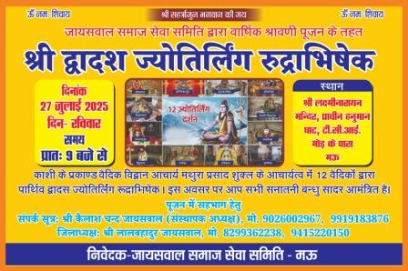 मऊ। जायसवाल समाज सेवा समिति द्वारा आयोजित वार्षिक श्रावणी पूजन के दौरान इस वर्ष भी द्वादश ज्योतिर्लिंग सामूहिक रुद्राभिषेक का आयोजन रविवार 27 जुलाई को किया जायेगा। नगर के टीसीआई मोड़ स्थित हनुमान घाट पर लक्ष्मी नारायण मंदिर प्रांगण में आयोजित इस अनुष्ठान में जायसवाल समाज के साथ ही सभी सनातनी सहभाग कर सकते हैं। जानकारी देते हुए जिलाध्यक्ष लालबहादुर जायसवाल ने बताया कि इस वर्ष सामूहिक रुद्राभिषेक अनुष्ठान को संपन्न कराने के लिए काशी के प्रखंड वैदिक विद्वान आचार्य मथुरा प्रसाद शुक्ला में के नेतृत्व में 12 अन्य आचार्य आ रहे हैं। जिनके द्वारा वैदिक परंपराओं से मिट्टी के बारह शिवलिंग बनाकर द्वादश ज्योतिर्लिंग कवन कर सामूहिक रुद्राभिषेक किया जाएगा। इस कार्यक्रम में बड़ी संख्या में लोगों की उपस्थित रहेंगे।