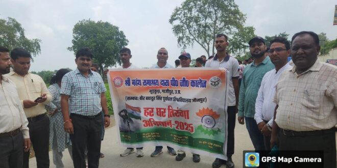 गाजीपुर। पीजी कालेज भुड़कुड़ा गाजीपुर में भारत सरकार के आदेशानुसार प्राचार्य प्रो बृजेश कुमार जायसवाल जी के निर्देशन में एवं प्रो रमेश कुमार के नेतृत्व में महाविद्यालय के समस्त प्राध्यापक गण, गैरशैक्षणिक वर्ग एवं छात्र / छात्राओं के द्वारा महाविद्यालय परिसर से भुड़कुड़ा मठ तक तिरंगा यात्रा एवं प्रभात फेरी जुलूस निकाला गया जिसके द्वारा बन्दे मातरम् तथा भारत माता की जय के नारे लगाते हुए देशभक्ति को प्रदर्शित किया गया!उक्त तिरगां यात्रा में प्रो सत्य प्रकाश, प्रो शिवानन्द पांडेय, डा प्रदीप कुमार राय,डा राजेश कुमार केशरी,डा सर्वेश्वर प्रताप सिंह, डा सन्तोष मिश्रा, डा शेषनाथ यादव, डा सन्तोष यादव, डा धर्मेन्द्र सरोज,डा सुनील सिंह,डा धर्मेन्द्र मौर्या, डा विजय कन्नौजिया,डा ब्रजेश कुमार सिंह, डा जय प्रकाश सिंह, डा सुनिल सिंह गौतम, डा लालमणि सिंह, डा पारस नाथ यादव, डा अखिलेश सिंह, डा सर्वानन्द सिंह, अश्विनी सिंह दीक्षित आदि लोग विशेष रूप से सक्रिय रहे।