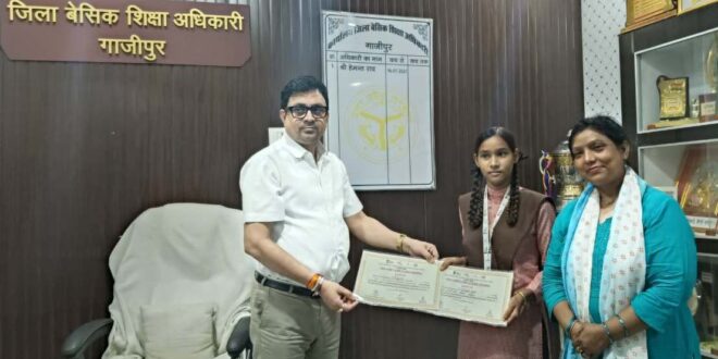 गाजीपुर! विज्ञान एवं प्रौद्योगिकी विभाग, भारत सरकार एवं राष्ट्रीय नव प्रवर्तन प्रतिष्ठा के संयुक्त तत्वाधान में आयोजित इंस्पायर मानक एवार्ड 2024-25 की जनपद स्तरीय प्रदर्शनी तथा प्रोजेक्ट प्रतियोगिता राजकीय बालिका इण्टर कॉलेज, मलदहिया, वाराणसी में दिनांक 26 जुलाई, 2025 में संपन्न हुई थी, जिसमें कम्पोजिट विद्यालय डिलिया, सदर, गाजीपुर की कक्षा-07 की छात्रा कंचन का प्रोजेक्ट, जो स्वचालित नाली सफाई प्रणाली पर था, वो राज्य स्तर पर चयनित हुआ। इस प्रोजेक्ट को कंचन ने अपनी विज्ञान गाइड, डॉक्टर रितु श्रीवास्तव के मार्ग-दर्शन में बनायी थी। आज दिनांक 20.08.2025 को हेमन्त राव, जिला बेसिक शिक्षा अधिकारी, गाजीपुर द्वारा कंचन को प्रशस्ति पत्र व मेडेल देकर प्रोत्साहित व सम्मानित किया गया। साथ ही कंचन को आगामी राज्य स्तरीय प्रतियोगिता में विजयी होने व उज्ज्वल भविष्य के लिये असीम शुभ-कामनाएं भी दी गयीं।