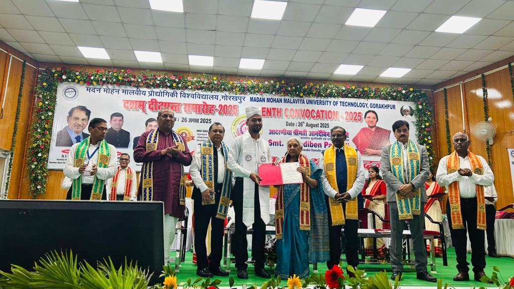 लखनऊ। मदन मोहन मालवीय प्रौद्योगिकी विश्वविद्यालय, गोरखपुर का दशम दीक्षांत समारोह दिनांक 26 अगस्त 2025, मंगलवार को विश्वविद्यालय के बहुउद्देशीय सभागार में आयोजित हुआ। दसवें दीक्षांत समारोह की अध्यक्षता माननीया कुलाधिपति एवं राज्यपाल, उत्तर प्रदेश आनंदीबेन पटेल ने की जबकि मुख्य अतिथि के रूप में अध्यक्ष, इसरो एवं सचिव, अंतरिक्ष विभाग, भारत सरकार डॉ वी नारायणन उपस्थित रहे। विशिष्ट अतिथि के रूप में माननीय मंत्री, मत्स्य विभाग, उत्तर प्रदेश सरकार डॉ संजय निषाद जबकि विशेष अतिथि के रूप में पावर ग्रिड कॉर्पोरेशन ऑफ इंडिया के कार्यकारी निदेशक युगेश कुमार दीक्षित मौजूद रहे। कुलाधिपति, मुख्य अतिथि, एवं विशिष्ट अतिथि सहित अन्य अतिथियों ने समारोह स्थल पर आगमन के उपरांत दीक्षांत वेश धारण कर शैक्षणिक शोभायात्रा के साथ सभागार में प्रवेश किया। शैक्षणिक शोभायात्रा के सभागार में विराजमान होने के बाद विद्यार्थियों ने वंदे मातरम् का गायन किया। इसके बाद माननीया कुलाधिपति द्वारा दीक्षांत समारोह के औपचारिक आरम्भ की घोषणा की गई। उपाधि प्रदान करने से पूर्व उत्तीर्ण हो रहे विद्यार्थियों को कुलपति महोदय ने निम्नलिखित दीक्षोपदेश दिया : – कुलाधिपति की अनुमति से मैं तुमको इस प्रकार का प्रबोधन देता हूं:-