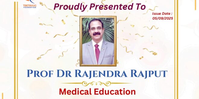 गाजीपुर। होम्योपैथिक मेडिकल कॉलेज के प्राचार्य और कम्युनिटी मेडिसिन विषय के आचार्य प्रो. डा. राजेंद्र राजपूत को त्रेता युग फाउंडेशन द्वारा डॉ सर्व पल्ली राधाकृष्णन के जन्म दिवस समारोह (शिक्षक दिवस), 5सितंबर को उनके शैक्षणिक योगदान के लिये *डॉ एस राधाकृष्णन विजनरी मेंटर अवार्ड 2025* से सम्मानित किया गया। उल्लेखनीय है कि “राष्ट्रपति पुरस्कार” और ‘अमेरिकन एक्सीलेंस अवार्ड इन कम्युनिटी हेल्थ एंड हॉलिस्टिक मेडिसिन’ से नवाजे जा चुके डॉ राजेंद्र राजपूत पिछले 25 वर्षों से पूरे भारत और विदेशों में किशोर यौन स्वास्थ, जीवन शैली रोगों, मानसिक स्वास्थ्य उन्नयन, करियर मार्गदर्शन एवं परामर्श द्वारा लाखों युवाओं का मार्गदर्शन कर चुकें है। होम्योपैथिक मेडिकल एजुकेशन के अलावा इंटीग्रेटेड मेडिसीन, कम्युनिटी हेल्थ केयर, विकलांगता जांच एवं पहचान सहित विभिन्न परियोजनाओं का सफल संचालन आप करते हैं। अध्ययन, अध्यापन और शोध कार्य के अलावा साहित्य सृजन और पत्रकारिता में भी आप दखल रखते हैं, आपकी लगभग 10 किताबें, 4शोध ग्रन्थ और विभिन्न विषयों पर आलेख लगातार प्रकाशित होते रहते हैं। आप कम्युनिटी साइकोलॉजी एसोसिएशन ऑफ इंडिया, इंडियन एकेडमी ऑफ हेल्थ साइकोलॉजी, इंडियन स्कूल साइकोलॉजी संस्थाओं के प्रवर्तक, डॉ भीमराव अंबेडकर विश्व विद्यालय, आगरा के डीन, राष्ट्रीय होम्योपैथिक आयोग के विषय विशेषज्ञ और मदन मोहन मालवीय टीचर्स ट्रेनिंग, विश्व विद्यालय अनुदान आयोग के प्रशिक्षक भी हैं। इस अवसर पर होम्योपैथिक के निदेशक डॉ प्रमोद सिंह, प्रो डा स्वतंत्र सिंह, डॉ बृजेंद्र सिंह(एम डी लैब्स), सेवाश्रम हॉस्पिटल के डॉ डी पी सिंह, न्यू होराइजन एकेडमी के अमरनाथ राय, अजय राय, प्रज्ञा प्रवाह के माधव कृष्ण, ब्रह्मा कुमारी ईश्वरीय विश्व विद्यालय की बहन निर्मला जी, प्रो डॉ सुबोध त्रिपाठी तथा पत्रकारिता जगत के विभिन्न मित्रों ने प्रसन्नता व्यक्त की है।