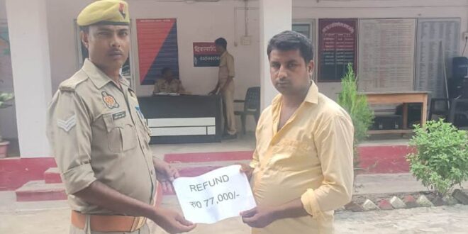 गाजीपुर। पुलिस अधीक्षक जनपद गाजीपुर द्वारा जनपद में अपराधों की रोकथाम एवं साइबर धोखाधड़ी रोकने हेतु चलाये जा रहे अभियान के तहत सोनू मौर्या निवासी ग्राम भदौरा ग्राम घिनहा थाना शादियाबाद जनपद गाजीपुर के साथ दिनाँक 30.08.2025 को यूपीआई के द्वारा हुए फ्रॉड जिसके उपरांत पीडित द्वारा तत्काल साइबर हेल्प लाइन 1930 पर कॉल करके ऑनलाइन शिकायत दर्ज करायी गयी थी । जिस सम्बंध में सूचना प्राप्त होने पर साइबर सेल जनपद गाजीपुर व थाना शादियाबाद की संयुक्त टीम द्वारा त्वरित कार्यवाही करते हुये 48 घंटे के अंदर शिकायतकर्ता सोनू मौर्या उपरोक्त के खाते में उनके साथ फ्रॉड की गयी धनराशि 77000 रू0 की धनराशि वापस करायी गयी । अपनी धनराशि वापस पाकर पीड़ित द्वारा साइबर सेल गाजीपुर व सम्बंधित थाने की पुलिस टीम की सराहना करते हुए सह्दय धन्यवाद दिया गया ।