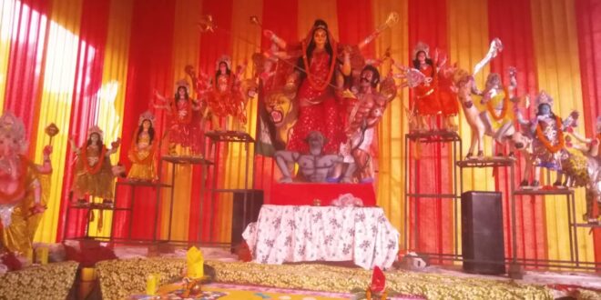 गाजीपुर। लोग एक तरफ नवरात्र के प्रथम दिन व्रत रखा वही दूसरी तरफ माता रानी के भक्तगण नन्दगंज क्षेत्र के विभिन्न जगहों पर बनाए गए पंडालों में मां दुर्गा की प्रतिमाएं स्थापित कर पूजा-पाठ कर मां दुर्गा के आंखों का पट खोल दिया । नन्दगंज बाजार में पांच स्थानों पर भव्य पूजा पंडाल बनाकर मां दुर्गा की प्रतिमाएं स्थापित किया गया।जिसमें बाजार के नन्दगंज औद्योगिक क्षेत्र के पास, शादियाबाद मोड़ , चोचकपुर तिराहा , स्टेशन चौराहा थाना के समीप और पश्चिम रेलवे क्रॉसिंग के पास हनुमान मंदिर पर लम्बे अर्से से मां दुर्गा की प्रतिमाएं स्थापित की जाती हैं।पंडालों को बनाने में भक्त गण पहले से ही रात —दिन मेहनत कर भव्य रूप से बनाते और विद्युत झालरों आदि से सजाते है।सोमवार को नवरात्र शुरू होते ही लोग व्रत रखना शुरू कर दिए और नवरात्र भर लोग मां दुर्गा के पंडालों पर जाकर सुबह और शाम आरती में भाग लेते है।दिन में बाजार में ग्रामीण क्षेत्रों से आए हुए लोग मां दुर्गा का दर्शन करते हैं।