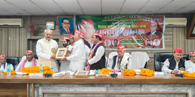 गाजीपुर। समाजवादी पार्टी के शिक्षक सभा के राष्ट्रीय कार्यकारिणी द्वारा आयोजित शिक्षक सम्मेलन समाजवादी शिक्षक सभा के राष्ट्रीय सचिव भरत यादव की अध्यक्षता में जिला पंचायत सभागार में सम्पन्न हुई। इस सम्मेलन में एनपीएस यूपीएस समाप्त कर पुरानी पेंशन सेवा लागू करने , अशासकीय सहायता प्राप्त माध्यमिक विद्यालयों में वित्तविहीन शिक्षकों की सेवा नियमावली बनाने एवं उनके पुर्ण कालिक शिक्षक बनने की अवधि तक सम्मान जनक मानदेय प्रदान करने,69हजार शिक्षकोंके की भर्ती में हुए आरक्षण घोटाले की जांच कराने विश्वविद्यालयों में अस्सिटेंट और एसोसिएट प्रोफेसर की नियुक्ति में आरक्षण के नियमों की अवहेलना आदि विषयों पर गंभीर चर्चा की गयी।इस सम्मेलन कै मुख्य अतिथि समाजवादी शिक्षक सभा के राष्ट्रीय अध्यक्ष वीडी मिश्रा ने वर्तमान भाजपा सरकार को शिक्षा और शिक्षक विरोधी बताते हुए कहा इस सरकार की नीतियां देश के भविष्य को अंधकार में ले जा रही है। प्राथमिक विद्यालयों के मर्जर और बंद किये जाने के प्रदेश सरकार के फैसले की चर्चा करते हुए कहा यह सरकार आने वाली पीढ़ी के भविष्य को अंधकार में ढकेल रही है। यह सरकार केवल देशवासियों का भावनात्मक शोषण कर रही है।इसे युवाओं के भविष्य की कोई चिंता नहीं है। बेरोजगारी के आलम में इस देश का नौजवान हताश और निराश हैं। इस देश का किसान, नौजवान सरकार की गलत नीतियों के चलते आत्महत्या करने को मजबूर हैं।इस सम्मेलन के विशिष्ट अतिथि नेता प्रतिपक्ष लाल बहादुर यादव ने कहा आज मुल्क गंभीर परिस्थितियों के दौर से गुजर रहा है। सरकार को न किसानों की चिंता है न नौजवानों की । यह सरकार केवल पूंजीपतियों के हित संरक्षित करने में व्यस्त हैं। उन्होंने कहा यह सरकार तानाशाही के रास्ते पर चल रही है। इसकी साम्प्रदायिक सोच के चलते देश की गंगा जमुनी तहजीब, साम्प्रदायिक और सामाजिक सद्भाव खतरे में है। इस मुल्क के धर्मनिरपेक्ष स्वरूप, लोकतंत्र और संविधान तथा सामाजिक न्याय की रक्षा के लिए इस सरकार को सत्ता से बेदखल करने की जरूरत है।समाजवादी पार्टी के जिलाध्यक्ष गोपाल यादव ने सभी अतिथियों का अंगम् वस्त्र एवं स्मृति चिन्ह प्रदान कर सम्मानित किया। इस सम्मेलन में मुख्य रूप से शिक्षक सभा के राष्ट्रीय महासचिव कुलदीप यादव, सुदर्शन यादव, डॉ नन्हकू यादव, मार्कण्डेय यादव,राजेश यादव,हरिकेष यादव, सदानंद यादव, अशोक चौहान, कन्हैयालाल विश्वकर्मा, रमेश यादव,राजेश यादव , आजाद राय, गोविंद यादव, अनिल यादव आदि मौजूद थे।इस सम्मेलन का संचालन शिक्षक सभा के राष्ट्रीय सचिव ओमप्रकाश यादव ने किया।