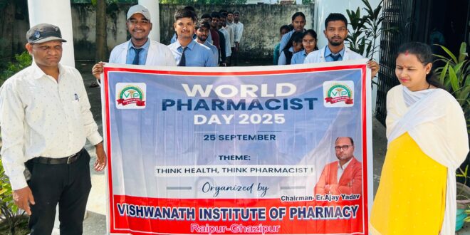 गाजीपुर। विश्वनाथ इंस्टिट्यूट ऑफ़ फ़ार्मेसी, रायपुर (ग़ाज़ीपुर) में विश्व फ़ार्मेसी दिवस बड़े उत्साह और हर्षोल्लास के साथ मनाया गया।कार्यक्रम की शुरुआत प्रभात फेरी से हुई, जिसमें छात्र-छात्राओं एवं स्टाफ़ ने बढ़-चढ़कर हिस्सा लिया और आसपास के क्षेत्रों में फ़ार्मेसी के महत्व व स्वास्थ्य जागरूकता का संदेश दिया।इसके पश्चात् कॉलेज प्रांगण में रंगोली प्रतियोगिता, क्विज़ प्रतियोगिता एवं पोस्टर प्रेज़ेंटेशन का आयोजन किया गया, जहाँ छात्रों ने अपनी रचनात्मकता, ज्ञान और प्रतिभा का शानदार प्रदर्शन किया।