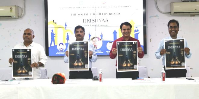 लखनऊ। मदन मोहन मालवीय प्रौद्योगिकी विश्वविद्यालय, गोरखपुर में आगामी कैरियर काउंसलिंग कार्यक्रम ‘दृश्या’ का पोस्टर विमोचन आज विश्वविद्यालय परिसर में सम्पन्न हुआ। यह कार्यक्रम 11 व 12 अक्टूबर, 2025 को द सोशल इंजीनियर्स बोर्ड द्वारा तकनीकी उप-परिषद, छात्र क्रियाकलाप परिषद के अंतर्गत आयोजित किया जाना सुनिश्चित है। कार्यक्रम के अवसर पर विश्वविद्यालय के कार्यवाहक कुलपति प्रो. वी. के. गिरी, प्रो. बी.के. पाण्डेय, अध्यक्ष, छात्र क्रियाकलाप परिषद, डॉ. पल्लव गुप्ता, प्रभारी, तकनीकी उप-परिषद एवं डॉ. रोहित बाबू, समन्वयक, द सोशल इंजीनियर्स बोर्ड, विशेष रूप से उपस्थित रहे। कार्यक्रम के उदघाटन सत्र में सभी गणमान्य अतिथियों का स्वागत एवं परिचय डॉ० पल्लव गुप्ता द्वारा कराया गया। प्रो० बी०के० पाण्डेय ने बोर्ड की सक्रियता एवं प्रगति की सराहना करते हुए आयोजन समिति और छात्र पदाधिकारियों को आगामी कार्यक्रम की सफलता हेतु शुभकामनाएँ प्रदान कीं। इस अवसर पर प्रो० वी० के० गिरी ने कहा कि आने वाले भविष्य के छात्रों को इस प्रकार के सत्रों में प्रतिभाग करना चाहिए जिससे वे अपने करियर और जीवन में सही विकल्पों का चयन कर सकें तथा इस संस्थान और देश के विकास में अपना सक्रिय योगदान दे सकें। अंत में डॉ रोहित बाबू द्वारा धन्यवाद ज्ञापन दिया गया।
