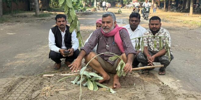 गाजीपुर। लट्ठे से नापा सड़क के गड्ढे; चार किलोमीटर सड़क में साढ़े तीन किमी मिले गड्ढे। गड्ढों में बेहया गाड़कर खतरों से किया आगाह।सामाजिक कार्यकर्ता एवं समग्र विकास इंडिया के राष्ट्रीय अध्यक्ष ब्रज भूषण दूबे ने इस प्रकार का अनोखा विरोध गाजीपुर पीजी कालेज से आदर्श गांव बाजार तक किया।जगह जगह सड़क में हुए खतरनाक गड्ढों में सामाजिक कार्यकर्ताओं ने बेहया और मंदार के पौधे लगाकर राहगीरों को आगाह किया की खतरों से अपनी जान वे स्वयं बचाएं इसके लिए लोक निर्माण विभाग जिला प्रशासन एवं जनप्रतिनिधि जिम्मेदार नहीं होंगे। उन्होंने भाजपा के डबल इंजन की सरकार को जमकर कोसा और कहा कि सत्ता की आंखों पर चढ़े चश्में से मदान्ध लोगों को खूनी सड़कें दिखाई नहीं देती हैं।अफसोस जताते हुए कहा कि स्वयं कचहरी, विकास भवन, जनपद न्यायालय, पुलिस अधीक्षक के अगल-बगल की सड़कें जानलेवा हो गई हैं। आम आदमी सड़कों का टैक्स देता है पेट्रोल डीजल एवं अपने वाहनों का। श्री दूबे ने जिले के अधिकारियों के साथ सांसद विधायकों को इसके लिए जिम्मेदार बताया। कुछ लोगों के यह कहने पर कि सांसद विधायक सपा के हैं, विपक्ष की बात भाजपा सरकार मानती ही नहीं है तो श्री दूबे ने कहा कि क्या विपक्षी जनप्रतिनिधि जनतांत्रिक तरीके से सत्याग्रह और जनांदोलन भी नहीं कर सकते? उन्होंने सड़क के गड्ढों को भरने के लिए जिला प्रशासन को एक सप्ताह का समय दिया। ऐसा न होने पर बड़े आंदोलन की चेतावनी दिया। उक्त अवसर पर जेसी तिवारी वंशराज मौर्य, हनुमान विंद, गुल्लू सिंह यादव, शशांक, गौरव, शौर्य आदि लोग उपस्थित थे।
