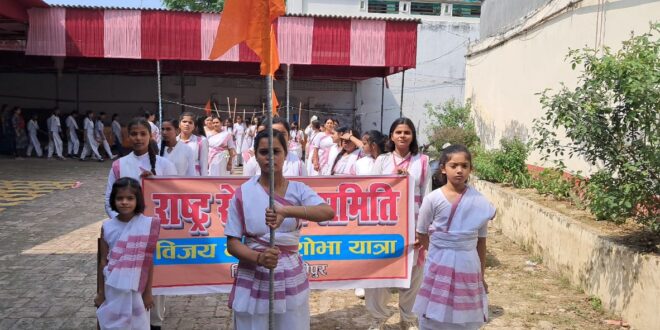 गाजीपुर। राष्ट्र निर्माण में नारी शक्ति के योगदान को लेकर राष्ट्र सेविका समिति के तत्वाधान में सोमवार को अग्रसेन मैरेज हाल में आयोजित की गयी। विजयदशमी कार्यक्रम के उपलक्ष्य मे मुख्य अतिथि अर्चना राय प्रधानाचार्या लक्ष्मी बाई इण्टर कालेज व पूजा श्रीवास्तव प्रधानाचार्या बैजनाथ इण्टर कालेज एवं मुख्य वक्ता शिवानी सिंह जिला सह बौधिक प्रमुख ने संयुक्त रूप से अष्ट भुजा माता, राष्ट्र सेविका समिति की संस्थापिका वंदिनी लक्ष्मीबाई केलकर मौसी व द्वितीय संचालिका सरस्वती बाई आप्टे के चित्र पर मार्लापण व दीप प्रज्जवलि कर कार्यक्रम का शुभारम्भ किया गया। कार्यक्रम में मुख्य वक्ता ने बताया कि यह हिन्दू समाज का मातृ शक्ति का संगठन है, समिति की स्थापना वंदिनी लक्ष्मीबाई केलकर ने सन् 1936 मे स्थापना की गयी। इस समारोह का शुभारम्भ ध्वजारोहण व शस्त्र पूजन से हुआ। गणवेश व मंगलवेश धारी सेविकाओं ने अनुशासित शोभा यात्रा, संगठन शक्ति एवं आत्मरक्षा का सशक्ति संदेश दिया। विजयादशमी का पर्व असत्य पर सत्य की, अधर्म पर धर्म का विजय का प्रतीक है। नारी शक्ति ही राष्ट्र की आधारशीला है और उसका शारीरिक, मानसिक व अध्यात्मिक रूप से सशक्त होना आवश्यक है। उन्होने समिति के तीन आदर्शो मातृत्व, कृतित्व और नेतृत्व के महत्व पर प्रकाश डालते हुए सेविकाओ से समाज में सकारात्मक परिवर्तन के लिए सक्रिय होने का आहवाहन किया। उन्होने राष्ट्र निर्माण मे महिलाओ की भूमिका को समय देने की आवश्यकता पर बल देने की बात बतायी और साथ ही साथ पंच परिवर्तन में कुटुम्ब प्रबोधन, समरसता, पर्यावरण, स्वदेशी जागरण, नागरिक कतर्व्य पर विस्तृत प्रकाश डाला और व्यक्ति का व्यक्तित्व, कृतित्व व नेतृत्व का निर्माण हमारे शाखा से होता है जो कि एक घंटे के लिए जरूरी है। वंदे मातरम, भारत माता के आरती के साथ कार्यक्रम सम्पन्न हुआ। इस अवसर पर जिला कार्यवाहिका नीलम चौबे, नगर कार्यवाहिका सोनी सिंह, प्रियंका दीदी, कल्याणी दीदी, प्रेमलता दीदी, पलक, रोशनी, श्वेता, पूनम, ज्योति, पूजा, निधि व अन्य सेविकाओ की उपस्थित रही।