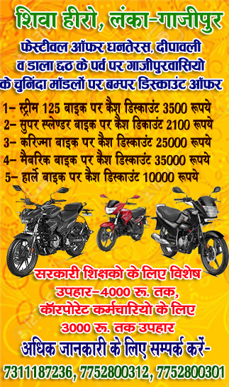 गाजीपुर। देश की सबसे बड़ी बाइक निर्माता कंपनी हीरो मोटोकॉर्प के डीलर शिवा हीरो लंका गाजीपुर ने पावन पर्व धनतेरस, दीपावली व डाला छठ के अवसर पर गाजीपुरवासियो के लिए चुनिंदा मॉडलो पर फेस्टीवल ऑफर के तहत हीरो के चुनिंदा मॉडलो पर बम्पर कैश डिसकाउंट ऑफर का ऐलान किया है। शिवा हीरो के प्रोपराईटर विनोद कुमार सिंह ने बताया कि फेस्टिवल ऑफर के तहत स्ट्रीम बाइक पर 3500 रूपये का कैश डिस्काउंट, सुपर स्प्लेण्डर बाइक पर 2100 रूपये, करिज्मा बाइक पर 25000 रूपये, मैबरिक बाइक पर 35000 व हार्ले बाइक पर 10000 रूपये का डिस्काउंट दिया जा रहा है। उन्होने बताया कि सरकारी, अर्धसरकारी शिक्षको के लिए 4000 रूपये तक का विशेष उपहार मिलेगा, कॉपरेट कर्मचारियो के लिए 3000 रूपये तक का उपहार मिलेगा। अधिक जानकारी के लिए मोबाइल नंबर’ 7311187236, 7752800312 व 7752800301 पर सम्पर्क करें।