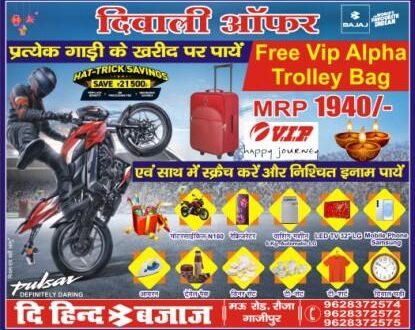 गाजीपुर। भारत की प्रसिद्ध बाइक निर्माता कंपनी बजाज ऑटो के डीलर द हिंद बजाज मऊ रोड रौजा गाजीपुर ने दीपावली आफर स्कीम का बंपर ऐलान किया है। द हिंद बजाज के प्रोपराइटर रिशू भाई ने बताया कि बजाज के प्रत्येक बाइक के खरीद पर बाइक ग्राहकों को वीआईपी अल्फा ट्रॉली बैग एकदम फ्री मिलेगा। इसके साथ कूपन को स्क्रैच करने पर एक निश्चित उपहार मोटर साइकिल, फ्रीज, वाशिंग मशीन, एलजी का एलईडी टीवी, सैमसंग का मोबाइल फोन, ट्रैवल पैक, आयरन, डीनर सेट, टी-शेट, टी-शर्ट और दिवाल घड़ी का निश्चित उपहार पायेंगे। अधिक जानकारी के लिए मोबाइल नम्बर 9628372574, 9628372572, 9628372575 पर संपर्क करें।