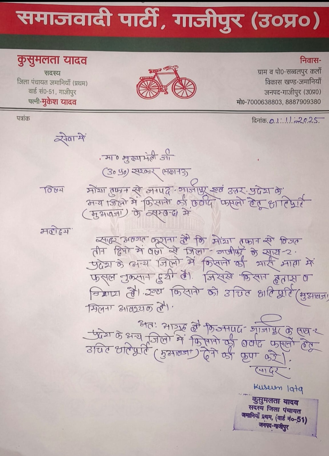 गाजीपुर। जमानियां प्रथम के जिला पंचायत सदस्य कुसुमलता यादव ने मुख्यमंत्री आदित्यनाथ योगी को पत्र लिखकर मोधा तुफान से हुए भारी वर्षा के कारण फसलो को क्षति के बारे में अवगत कराया है। कुसुमलता यादव ने मुख्यमंत्री से आग्रह किया है कि तत्काल किसानो को क्षतिपूर्ति दिया जाये जिससे कि इस भारी संकट से किसान उबर पायें। इस संदर्भ में जिला पंचायत सदस्य कुसुमलता यादव ने पूर्वांचल न्यूज डॉट काम को बताया कि जमानियां धान का कटोरा क्षेत्र कहा जाता है, धान के लिए पूरे पूर्वांचल में जमानियां क्षेत्र प्रसिद्ध है लेकिन अधिक वर्षा और तेज हवा के चलते धान की फसलें खेतो में गिर गयी है और फसले काटी गयी थी वह खेतो में डूब गयी है जिससे कि धान के फसल को काफी नुकसान हुआ है। मंहगे खाद, मजदूरी और गंगा के बाढ के चलते किसान पहले से ही अर्थिक रूप से काफी परेशान थे, उसपर से यह भंयकर तुफानी बारिश हो गयी। जिसके चलते किसान भुखमरी के कगार पर है। उन्होने कहा कि इस बरसात से बाजरे, चना, सरसो और सब्जी के फसलो को भी काफी नुकसान हुआ है। उन्होने मुख्यमंत्री से मांग किया है कि जिन किसानो का बीमा नही हुआ है उन्हे भी मुआवजा दिया जाये।