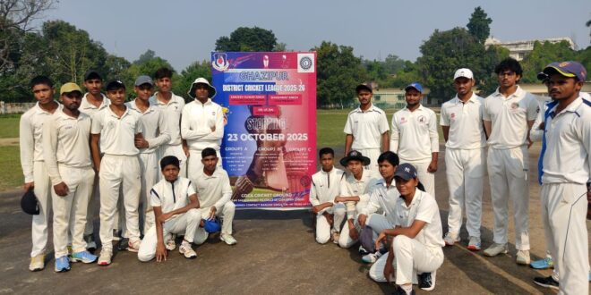 गाजीपुर डिस्ट्रिक्ट क्रिकेट एसोसिएशन (सबद्ध – उत्तर प्रदेश क्रिकेट एसोसिएशन) के तत्वाधान में गाजीपुर के स्थानीय स्वामी सहजानंद स्नातकोत्तर महाविद्यालय गाजीपुर के जीडीसीए मैदान पर खेले जा रहे गाजीपुर डिस्ट्रिक्ट क्रिकेट लीग 2025 श्रृंखला का आज का मैच माँ भागीरथी मेडीकल और ए.पी.आर.सी.– ब्लू के बीच खेला गया | मैच के पूर्व आज के मैच के दोनों अंपायर स्मति राय एवं सौरभ तिवारी ने रंजन सिंह के साथ पिच का निरिक्षण किया | आज के मैच में ए.पी.आर.सी.– ब्लू ने टॉस जीतकर पहले बल्लेबाजी करने का निर्णय लिया | पहले बल्लेबाजी करते हुए ए.पी.आर.सी.– ब्लू की टीम मैच के 37वें ओवर की पहली गेंद पर मात्र 95 रनों के स्कोर पर पर आल आउट हो गयी | माँ भागीरथी मेडीकल के तरफ से बृजेश बिन्द ने सर्वाधिक 3 एवं राज्यवर्धन, आदित्य कुशवाहा व सौरभ श्रीवास्तव ने 2-2 तथा अनुपम पाण्डेय ने 1 विकेट लिया | 96 रनों के लक्ष्य का पीछा करते हुए माँ भागीरथी मेडीकल की टीम ने कुलदीप के 23 गेंदों पर 44 तथा आदित्य सिंह के नाबाद 26 रनों के बदौलत मैच के 10वें ओवर की तीसरी गेंद पर एक विकेट के नुकसान पर 96 रन बनाकर मैच अपने नाम कर लिया | ए.पी.आर.सी.– ब्लू के तरफ से अमनदीप यादव ने एकमात्र विकेट लिया | आज के मैच में स्मृति राय एवं सौरभ तिवारी ने अंपायर तथा प्रीतम, मनीष, शौर्या वर्मा ने स्कोरर की भूमिका निभाई | इस अवसर पर गाजीपुर डिस्ट्रिक्ट क्रिकेट एसोसिएशन के अध्यक्ष शाश्वत सिंह ने बताया कि श्रृंखला का अगला मैच यंग स्टार – रेड और मवेरिक्स के बीच खेला जायेगा |