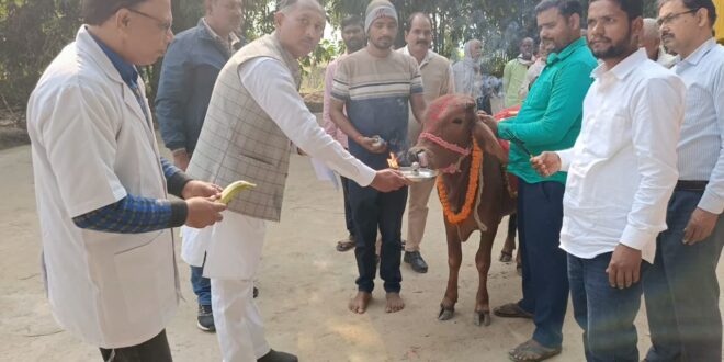 गाजीपुर। बिरनो ब्लाक के ग्राम पलहीपुर डंगरहा में पं. दीनदयाल उपाध्याय पशु आरोग्य शिविर का आयोजन महादेव जी के प्रांगण में सम्पन्न हुआ। कार्यक्रम की शुरुआत महादेव जी, लक्ष्मी जी एवं हनुमान जी के पूजन के बाद गौ पूजन तथा पं. दीनदयाल उपाध्याय की प्रतिमा पर पुष्पार्चन कर की गई। शिविर में ब्लॉक के पशु चिकित्सा अधिकारी डॉ. चन्द्रकांत सिंह अपनी पूरी टीम के साथ उपस्थित रहे। कार्यक्रम के मुख्य अतिथि भाजपा के पूर्व मंडल अध्यक्ष राजेश चौहान रहे। सबसे पहले पं. दीनदयाल उपाध्याय के चित्र पर पुष्पांजलि अर्पित की गई, इसके बाद गौ माता को माला पहनाकर कार्यक्रम का शुभारंभ किया गया। इस अवसर पर सैकड़ों की संख्या में किसान एवं पशुपालक शामिल हुए। विशेषज्ञों द्वारा पशुओं से संबंधित रोग, उनके उपचार एवं बचाव के उपायों पर विस्तार से जानकारी दी गई। कार्यक्रम में श्री श्यामलाल यादव, मानिक चौहान, रामलखन चौहान, मारकण्डेय चौहान, नरसिंह चौहान, जयप्रकाश यादव, नंदू यादव, रामअवतार, रामबचन चौहान, पार्वती देवी, शनिचरी देवी, विमला देवी, बलवन्त, अंगद सहित अनेक ग्रामीण मौजूद रहे।
