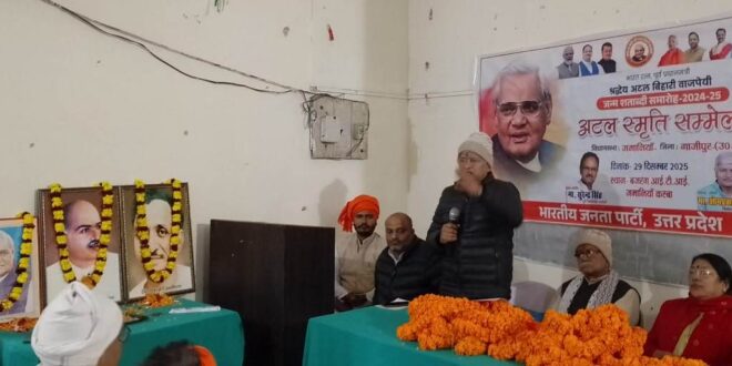 गाजीपुर। भारत रत्न, पूर्व प्रधानमंत्री अटल बिहारी वाजपेई की जन्म शताब्दी विधानसभा स्तर पर जमानिया नगर के पांडेय मोड़ स्थित बजरंग आई टी आई कॉलेज में अटल स्मृति सम्मेलन का गरिमामय आयोजन किया गया। कार्यक्रम में मुख्यातिथि चंदौली जिले के पूर्व जिला अध्यक्ष माननीय सुरेन्द्र सिंह जी ने अटल जी के व्यक्तित्व, कृतित्व और राष्ट्र के प्रति उनके समर्पण को याद करते हुए उन्हें भारतीय राजनीति का युग पुरुष बताया। भारतीय जनता पार्टी गाजीपुर के जिला अध्यक्ष ओम प्रकाश राय जी ने मुख्य अतिथि चंदौली जिले के जिला अध्यक्ष सुरेंद्र सिंह का स्वागत किया। सम्मेलन की शुरुआत पंडित दीनदयाल उपाध्याय जी ,डॉक्टर श्यामप्रसाद मुखर्जी जी और पूर्व प्रधानमंत्री अटल बिहारी वाजपेयी जी के छायाचित्र पर पुष्पांजलि कर किया गया। कार्यक्रम के अंत में वरिष्ठ भाजपा नेता देवव्रत चौबे जी के असामयिक निधन पर सभी कार्यकर्ताओं ने दो मिनट का मौन रख के भावपूर्ण श्रद्धांजलि अर्पित किया गया। उक्त अवसर पर कार्यक्रम के संयोजक सुनीता सिंह,जिला मंत्री विष्णु प्रताप सिंह,नगर पालिका अध्यक्ष जमानिया जयप्रकाश गुप्ता,जिलामंत्री विष्णु प्रताप सिंह जी, मंडल अध्यक्ष संदीप,तारकेश्वर,जयप्रकाश,अमित सिंह,राजीव चतुर्वेदी,मीडिया प्रभारी संजीत यादव आदि लोग उपस्थित रहे।