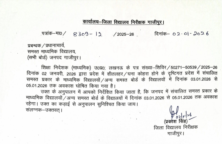 गाजीपुर। जिला विद्यालय निरीक्षक प्रकाश सिंह ने बताया कि शीतलहर व कोहरा को देखते हुए 3 जनवरी से 5 जनवरी तक के समस्त बोर्डो के कक्षा एक से लेकर कक्षा 12 तक के स्कूल बंद रहेंगे। आदेश न मानने वालों के खिलाफ कड़ी कार्रवाई होगी।