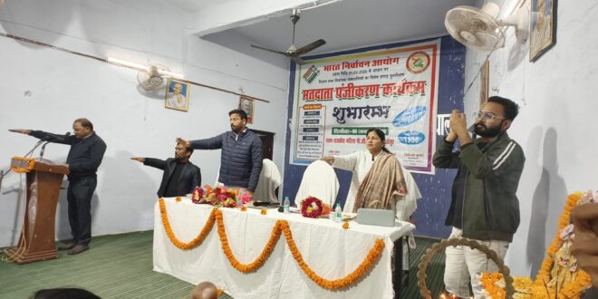 गाजीपुर। भारत निर्वाचन आयोग द्वारा विशेष पुनरीक्षण अभियान के तहत 1 जनवरी 2026 को अहर्ता प्राप्त कर रहे नवीन मतदाताओं के पंजीकरण एवं मतदान जागरूकता संबंधी जनपद स्तरीय कार्यक्रम का आयोजन राजकीय महिला पीजी कॉलेज गाजीपुर में हुआ। कार्यक्रम का शुभारंभ मुख्य अतिथि दिनेश कुमार उप जिला निर्वाचन अधिकारी/अपर जिला अधिकारी गाज़ीपुर एवं प्राचार्य प्रोफेसर अनिता कुमारी द्वारा दीप प्रज्वलन एवं सरस्वती प्रतिमा पर माल्यार्पण कर कार्यक्रम का फीता काट कर मतदाता पंजीयन कार्यक्रम का शुभारंभ किया गया । मतदाता पंजीयन कार्यक्रम में उपस्थित सभी जनपद स्तरीय अधिकारियों एवं निर्वाचन विभाग के कर्मचारी एवं छात्राओं का स्वागत कार्यक्रम संयोजक डॉ शिव कुमार द्वारा किया गया। कार्यक्रम का विषय प्रवर्तन करते हुए राजनीति विभाग के असिस्टेंट प्रोफेसर डॉ राजेश कुमार यादव ने छात्राओं को भारतीय लोकतंत्र में मतदान एवं मतदाताओं की महत्ता से परिचय कराते हुए मतदाता सूची में मतदाताओं का पंजीकरण को अनिवार्य एवं अपरिहार्य बताया। इससे पूर्व अपर जिलाधिकारी वि/रा दिनेश कुमार ने महाविद्यालय के राष्ट्रीय सेवा योजना के निर्वाचन साक्षरता क्लब की ओर से मतदाता पंजीकरण स्टॉल का फीता काटकर उद्घाटन किया तथा छात्रों को अधिक से अधिक लोगों को मतदाता बनने के लिए अपील किया। उप जिला निर्वाचन अधिकारी/अपर जिलाधिकारी वि0/रा0 ने अपने सम्बोधन में कहा कि हमारा देश एक लोक तंन्त्रात्मक देश है यहा प्रत्येक 05 वर्ष में चुनाव होते है। मतदान प्रत्येक व्यक्ति का मूल अधिकार है। मतदान से ही एक विकसित एंव मतबूत राष्ट्र का निर्माण होता है। हम सब का दायित्व है कि अपने-अपने मतो का शत-प्रतिशत उपयोग करते हुए एक मजबूत राष्ट्र के निर्माण में अपनी भागीदारी निभाये तथा अपने परिवार, पास -पडोस, गॉव, मुहल्ला में भी लोगो को मतदान हेतु प्रेरित करे। उप जिला निर्वाचन अधिकारी/अपर जिलाधिकारी वि0/रा0 ने जनपद के 18 वर्ष या उससे उपर के नये मतदाताओ से अपिल किया कि जिनके नाम मतदाता सूची मे छूटे हो एव नये मतदाता हेतु फार्म 6 नही भरा हो वे अपने नजदीकी बूथ पर या अपने बीएलओ से सम्पर्क कर विशेष अभियान तिथियों मे उपस्थित होकर अपना नाम जोड़वा सकते है एवं पोर्टल के द्वारा वोटर हेल्प लाइन एप्प के माध्यम से घर बैठे नये मतदाता के रूप मे शामिल हो सकते है।उन्होने कहा कि जनपद में 06 जनवरी,2026 से 06 फरवरी, 2026 तक यह अभियान चलेगा। विशेष संक्षिप्त पुनरीक्षण कार्यक्रम में मतदाताओं के नाम मतदाता सूचियों से जोडे व हटाये जायेगे । उन्होंने बताया कि यदि किसी मतदाता के नाम या अन्य किसी विवरण में संशोधन की आवश्यकता है तो अपना संशोधन भी करा सकते हैं एवं जो मतदाता एक ही विधानसभा क्षेत्र में 