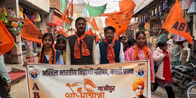 गाजीपुर। अखिल भारतीय विद्यार्थी परिषद गाजीपुर द्वारा स्वामी विवेकानंद जयंती के पावन अवसर पर आज शहर में भव्य शोभायात्रा का आयोजन किया गया। शोभायात्रा में हजारों की संख्या छात्र-छात्राओं, युवाओं एवं गणमान्य नागरिकों ने उत्साहपूर्वक सहभागिता की।शोभायात्रा का शुभारंभ एम.ए.एच. इंटर कॉलेज से हुआ, जो तुलसीया का पुल, चितनाथ, टाउन हॉल, मिश्रबाजार, महुआबाग सहित शहर के प्रमुख मार्गों से होती हुई आमघाट पार्क पर संपन्न हुई। यात्रा के दौरान स्वामी विवेकानंद के जीवन और विचारों पर आधारित विशेष आकर्षण का केंद्र रहीं। शोभा यात्रा के दौरान “उठो, जागो और लक्ष्य प्राप्ति तक रुको मत” तथा “युवा शक्ति—राष्ट्र शक्ति” जैसे प्रेरणादायी नारों से वातावरण को ओजस्वी बना दिया।एबीवीपी के प्रांत प्रवासी प्रांत सहमंत्री श्री अमन सिंह ने कहा कि स्वामी विवेकानंद के आदर्शों चरित्र निर्माण, राष्ट्र सेवा और युवा चेतना—को जन-जन तक पहुँचाने का संदेश दिया। आगे उन्होंने कहा कि स्वामी विवेकानंद के विचार आज के युवाओं के लिए मार्गदर्शक हैं और उनके बताए मार्ग पर चलकर ही सशक्त व आत्मनिर्भर भारत का निर्माण संभव है।शोभायात्रा के समापन पर वंदे मातरम् के 150 वर्ष पूर्ण होने के अवसर पर सामूहिक वंदे मातरम् गायन का आयोजन किया गया। इस दौरान विभाग संगठन मंत्री ने युवाओं से समाज व राष्ट्र निर्माण में सक्रिय भूमिका निभाने का आह्वान किया।उन्होंने कहा कि युवा कल का नहीं बल्कि आज का भविष्य है।इस नाते हम सब की जिम्मेदारी है कि शिक्षा के साथ राष्ट्र की भी सुरक्षा की जिम्मेदारी है। उक्त अवसर पर प्रांत कार्यकारणी सदस्य ईशान पॉल,कामदेश्वर सिंह,अंकित यादव,सिमरन,मधु सिंह,आकांक्षा शर्मा,समृद्धि राय,आदर्श शर्मा आदि कार्यकर्ता उपस्थित रहे।
