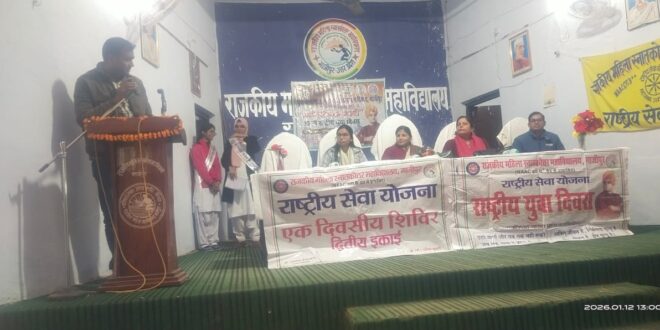 गाजीपुर! युवा कल्याण एवं प्रादेशिक ववकास दल विभाग गाजीपुर के तत्वावधान में महिला स्नातकोत्तर महाविद्यालय गाजीपुर में राष्ट्रीय युवा दिवस के अवसर पर गोष्ठी का आयोजन किया गया। कार्यक्रम मे मुख्य अतिथि अनिता कुमारी प्राचार्य महिला पीजी कॉलेज गाजीपुर, वरिष्ठ प्रोफेसर, क्षेत्रीय युवा कल्याण अधिकारी चंद्रकांत यादव, अखिलेश यादव, मुख्य कार्यक्रम अधिकारी रामनाथ केसवरवानी, एवं राष्ट्रीय सेवा योजना के अन्य कार्यक्रम अधिकारी इत्यादि उपस्थित रहे। गोष्ठी का आरंभ सर्वप्रथम मुख्य अतिथि एवं अन्य अतिथियों द्वारा स्वामी विवेकानंद जी की चित्र पर माल्यार्पण एवं पुष्प अर्पित कर के किया गया। मुख्य अतिथि एवम अन्य अतिथियों द्वारा पीजी कॉलेज की बच्चियों एवम अन्य को स्वामी विवेकानंद जी के जीवन एवं उनकी उपलब्धियों के बारे में जानकारी दी गई तथा विवेकानंद जी के विचारों को अपने अंदर आत्मसात करने को प्रेरित किया गया। मेधावी बच्चों को सम्मानित करते हुए कार्यक्रम की समाप्ति की गई। अंत में क्षेत्रीय युवा कल्याण अधिकारी सुश्री आंचल सिंह द्वारा सभी का आभार व्यक्त किया गया।