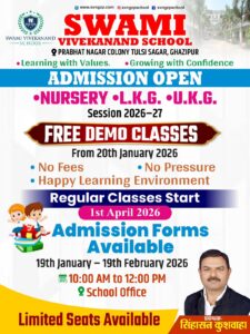 गाजीपुर। स्वामी विवेकानंद स्कूल प्रभात नगर कालोनी तुसलीसागर गाजीपुर में सत्र 2026-27 के लिए प्रवेश प्रारंभ हो गया है। स्कूल के प्रबंधक सिंहासन कुशवाहा ने बताया कि नर्सरी, एलकेजी, यूकेजी में प्रवेश प्रारंभ हो गया है। इसके लिए 20 जनवरी से डेमो क्लासेज शुरु हो गये हैं। इसके लिए कोई फीस नही लगेगा। उन्होने बताया कि एक अप्रैल से रेगुलर क्लासेज शुरु हो जायेंगे।