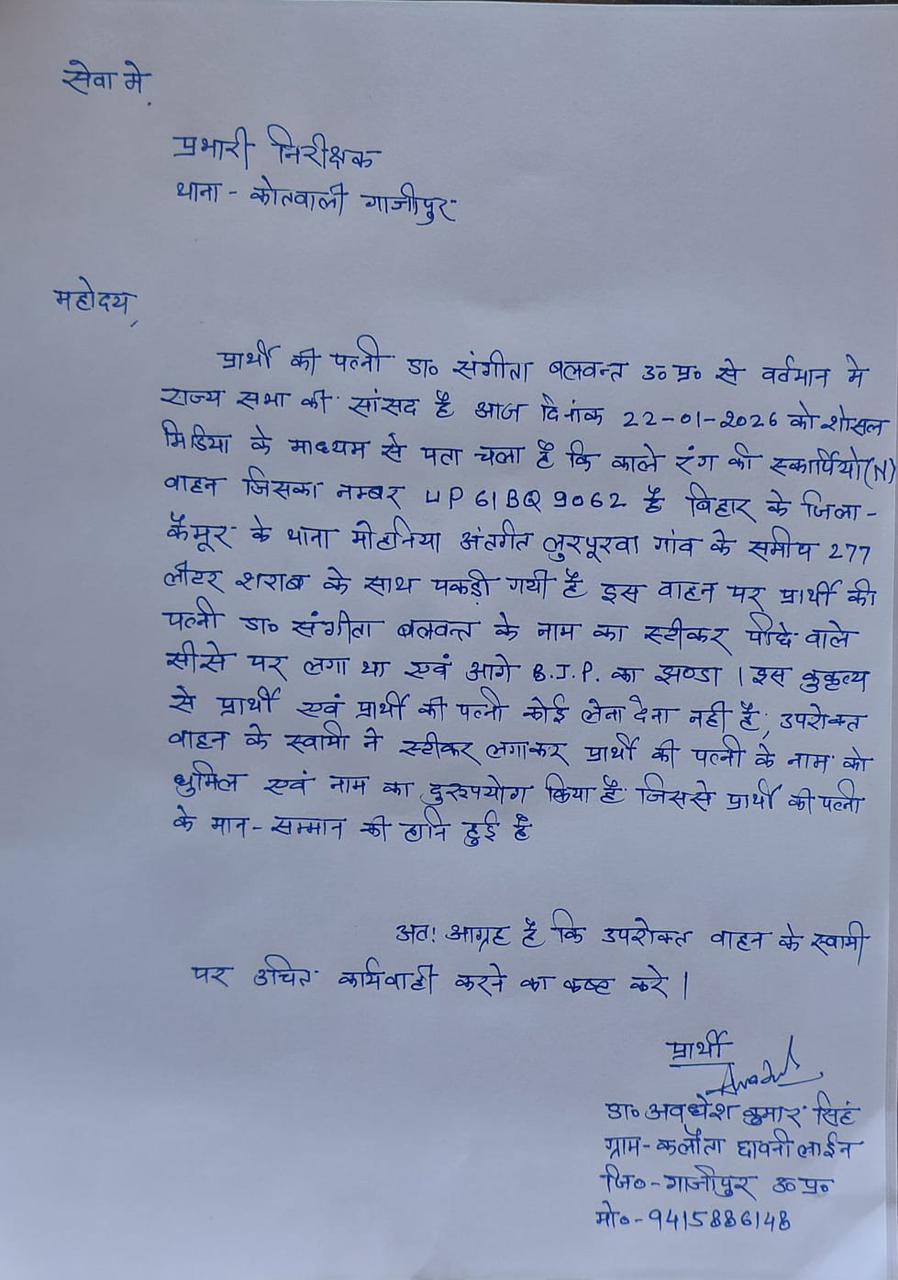 गाजीपुर। राज्यसभा सांसद डा. संगीता बलवंत के पति ने सदर कोतवाली में तहरीर देते हुए लिखा कि, प्रार्थी की पत्नी डा० संगीता बलवन्त उ० प्र० से वर्तमान में राज्य सभा की सांसद है आज दिनांक 22-01-2026 को शोसल मिडिया के माध्यम से पता चला है कि काले रंग की स्कार्पियो (N) वाहन जिसका नम्बर UP 61BQ 9062 है बिहार के जिला – कैमूर के थाना मोहनिया अंतर्गत लुरपूरवा गांव के समीय 277 लीटर शराब के साथ पकड़ी गयी है इस वाहन पर प्रार्थी की पत्नी डा० संगीता बलवत्त के नाम का स्टीकर पीछे वाले सीसे पर लगा था एवं आगे B.J.P. का झण्डा । इस कुकृत्य से प्रार्थी एवं प्रार्थी की पत्नी कोई लेना देना नहीं है, उपरोक्त वाहन के स्वामी ने स्टीकर लगाकर प्रार्थी की पत्नी के नाम को धुमिल एवं नाम का दुरुपयोग किया है जिससे प्रार्थी की पत्नी के मान-सम्मान की हानि हुई है। राज्यसभा सांसद के पति ने उपरोक्त वाहन के स्वामी पर उचित कार्यवाही करने की मांग किए हैं । थानाध्यक्ष ने मामले में गंभीरता बरतते हुए विधि सम्मत कारवाई की बात कही है।