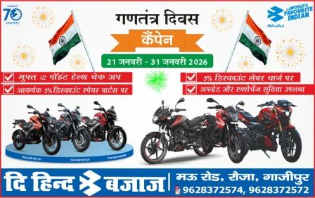 गाजीपुर। भारत की प्रख्यात बाईक निर्माता कंपनी बजाज ऑटो लिमिटेड के डीलर द हिन्द बजाज, मऊ रोड रौजा गाजीपुर ने गणतंत्र दिवस पर जनपदवासियो के लिए बजाज की बाइक खरीद पर बम्पर स्कीम का ऐलान किया है। द हिन्द बजाज प्रोपराईटर रिशू भाई ने पूर्वांचल न्यूज डॉट काम को बताया कि गणतंत्र दिवस के अवसर पर 125 सीसी प्लसर बाईक की खरीद पर 2 हजार का डिस्काउंट, पल्सर एन 160 की खरीद पर 3 हजार का डिस्काउंट, फ्रीडम 125 सीएनजी की खरीद पर 5 हजार का डिस्काउंट मिलेगा। इसके अलावा 31 जनवरी तक मुफ्त् 12. हेल्थ चेकअप, 5 प्रतिशत डिस्काउंट स्पेयर पार्ट पर और लेबर चार्ज पर 5 प्रतिशत का डिस्काउंट मिलेगा। उन्होने बताया कि इस अवधी में अपग्रेड और एक्सचेंज की भी सुविधा उपलब्ध है। अधिक जानकारी के लिए मोबाइल नंबर- 9628372572, 9628372574 पर सम्पर्क कर सकते है।