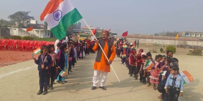 गाजीपुर। बाराचवंर विकास खण्ड स्थिति आर एस कान्वेंट स्कूल में 77वां गणतंत्र दिवस हर्षोल्लास के साथ मनाया गया। इस दौरान पूरा स्कूल परिसर देशभक्ति, उत्साह और गर्व के माहौल से सराबोर नजर आया। नर्सरी से लेकर कक्षा 12वीं तक के विद्यार्थियों ने देशभक्ति गीतों पर शानदार नृत्य और प्रस्तुतियां देकर समां बांध दिया। यह आयोजन सभी के लिए एक यादगार अनुभव बन गया। कार्यक्रम में नर्सरी कक्षा के नन्हे-मुन्ने बच्चे आकर्षक का केन्द्र रहे, जिन्होंने अपनी मासूमियत और तालमेल भरे डांस स्टेप्स से दर्शकों का दिल जीत लिया। बच्चों की शानदार प्रस्तुति के पीछे उनके शिक्षकों की कड़ी मेहनत रही। बच्चों ने मंच पर बेहतरीन प्रदर्शन कर सभी की तालियां बटोरीं। इससे पहले कार्यक्रम का शुभारम्भ संस्थापक/अध्यक्ष भीष्मदेव सिंह ने राष्ट्रीय ध्वज फहराने के साथ ही बच्चों को संदेश दिया। कहा कि 26 जनवरी 1950 के दिन से, हम अपने गणतन्त्र को, संवैधानिक आदर्शों की दिशा में आगे बढ़ा रहे हैं। स्कूल के प्रबंधक यशवन्त सिंह ने माँ सरस्वती जी एवं मां भारती के चित्र पर दीप प्रजज्वलित कर तथा पुष्पांजली अर्पित कर सास्कृतिक कार्यक्रम का शुभारंभ कराया।तत्पश्चात उन्होने कहा कि गणतन्त्र दिवस का पावन पर्व हमारे अतीत, वर्तमान और भविष्य में देश की दशा और दिशा का अवलोकन करने का अवसर होता है। इसी दिन हम अपनी राष्ट्रीय नियति के निर्माता बने। हमारे संविधान में निहित न्याय, स्वतन्त्रता, समता और बंधुता के आदर्श गणतन्त्र को परिभाषित करते हैं।कोआर्डिनेटर आनन्द तिवारी ने कार्यक्रम ने सास्कृतिक कार्यक्रम का संचालन शेरोशायरी के माध्यम से करते हुए छात्र-छात्राओं को संविधान के प्रति शपथ दिलवाया।इस अवसर पर वार्षिक खेल कूद प्रतियोगिता एवं सास्कृतिक कार्यक्रमो मे भाग लिए छात्र-छात्राओं मे मेडल ट्राफी का वितरण हुआ।मेडल ट्राफी पाकर छात्र-छात्राओं के चेहरे पर उत्साह देखने को मिला।इस दौरान स्कूल के संरक्षक परमहंस सिंह,मुकेश बाबा, जुनेद आलम,महेन्द्र सिंह,रामाकांत यादव,गौतम प्रजापति,अवनीश राय,विश्वजीत सिंह,जयप्रकाश भारती,हृदयनारायण,पियुष ठाकुर,लल्लन यादव,अखिलेश कुमार,सुमन सिंह कुशबाहा,अंजली जायसवाल,श्वेता ठाकुर,अनामिका सिंह,सिम्पल राय,लक्ष्मी सिंह,सुप्रिया,बलवन्त सिंह,अभिषेक सिंह राहूल सहित स्कूल के सभी कर्मचारी स्टाप मौजूद रहा।