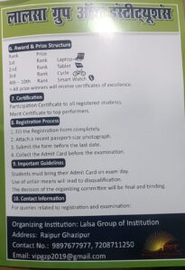 गाजीपुर। लालसा ग्रुप आफ इंस्टीट्यूशंस रायपुर बहरियाबाद के तत्वावधान में टैलेंट हंट प्रोग्राम परीक्षा 2025-26 का आयोजन 7 और 8 फरवरी को आयोजित होगा। यह जानकारी ग्रुप के प्रबंध निदेशक इंजी. अजय यादव ने पूर्वांचल न्यूज डाट काम को दी। उन्होने बताया कि प्रतिभा खोज कार्यक्रम परीक्षा- 2025-26 कक्षा 9, 10, 11 और 12 के लिए आयोजित की जा रही है। हाई स्कूल (9वीं और 10वीं) के लिए परीक्षा तिथि सात फरवरी 2026 और इंटरमीडिएट (11वीं और 12वीं) के लिए परीक्षा तिथि 8 फरवरी होगा। उन्होने बताया कि प्रतिभा खोज कार्यक्रम परीक्षा एक प्रतियोगी परीक्षा है जिसका उद्देश्य कक्षा 9वीं, 10वीं, 11वीं और 12वीं में पढ़ रहे विज्ञान स्ट्रीम के मेधावी छात्रों की पहचान करना और उन्हें प्रोत्साहित करना है। इस कार्यक्रम का उद्देश्य युवा शिक्षार्थियों में शैक्षणिक उत्कृष्टता, तार्किक सोच और वैचारिक समझ को बढ़ावा देना है। विज्ञान विषयों में प्रतिभावान छात्रों की प्रारंभिक अवस्था में पहचान करना, स्वस्थ शैक्षणिक प्रतिस्पर्धा को प्रोत्साहित करना, आकर्षक पुरस्कारों और सम्मानों के माध्यम से छात्रों को प्रेरित करना, स्व-मूल्यांकन और प्रदर्शन तुलना के लिए एक मंच प्रदान करना। इंजी. अजय यादव ने बताया कि कक्षा 9, 10, 11 या 12 में अध्ययनरत छात्र। केवल विज्ञान स्ट्रीम के छात्र ही पात्र हैं। किसी भी मान्यता प्राप्त विद्यालय/बोर्ड के छात्र आवेदन कर सकते हैं। उन्होने बताया कि परीक्षा का तरीका: ऑफलाइन (ओएमआर / लिखित), प्रश्नों का प्रकार: बहुविकल्पीय प्रश्न (एमसीक्यू), प्रश्नों की कुल संख्या: 100 और सभी प्रश्न एक अंक के हैं।, कुल अंक: 100 (कोई नकारात्मक अंकन नहीं है), माध्यम: अंग्रेजी / हिंदी, अवधि: 120 मिनट की होगी। उन्होने बताया कि कक्षा IX और XX के लिए पाठ्यक्रम: भौतिक विज्ञान, रसायन विज्ञान, जीव विज्ञान, गणित, सामान्य ज्ञान, कक्षा XI और XII के लिए पाठ्यक्रम: भौतिक विज्ञान, रसायन विज्ञान, गणित/जीव विज्ञान, सामान्य ज्ञान होगी। इंजी. अजय यादव ने बताया कि प्रतियोगिता में प्रथम स्थान के विजेता को लैपटॉप, द्वितीय टैबलेट, तृतीय को साइकिल और इस अन्य विजेताओं को स्मार्ट वॉच मिलेगा। इसके अलावा सभी पुरस्कार विजेताओं को उत्कृष्टता प्रमाण पत्र प्राप्त होंगे। अधिक जानकारी के लिए ललसा ग्रुप ऑफ इंस्टीट्यूशंस पता: रायपुर गाजीपुर के मोबाइल नम्बर 9897677977, 7208711250 व ईमेल: vipgzp2019@gmail.com पर संपर्क करें।
