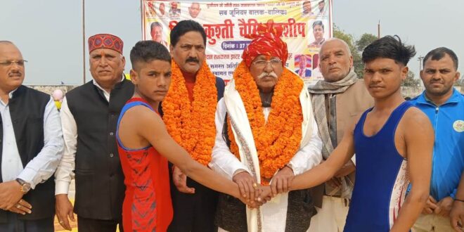 गाजीपुर! इशोपुर स्थित रामकरन इंटर कालेज के मैदान में जिला स्तरीय जूनियर बालक बालिका कुश्ती चैंपियनशिप का अयोजन किया गया। जहां जिले भर के पहलवानों ने अपने दांव पेंच दिखाए। चैंपियनशिप का उद्घाटन उत्तरप्रदेश कुश्ती संघ के महासचिव सुरेशचंद्र उपाध्याय ने पहलवानों का हाथ मिलाकर किया। इस दौरान रामकरन स्पोर्ट्स एकेडमी के इनडोर हॉल का उद्घाटन कर मूलभूत सुविधाओं सहित मैट लगाने का आश्वासन भी दिया। महासचिव सुरेशचंद्र ने कहा कि गाजीपुर की शौर्यमयी धरती वीर सैनिकों के साथ अब पहलवानों को पैदा करने लगीं है। आज ग्रामीण इलाके की बालिकाएं कुश्ती जैसे शारीरिक बलिष्ठता वाले खेल में आगे आ रहीं है। अभिभावकों से अनुरोध है कि बालिकाओं को किसी भी खेल में आने के लिए प्रोत्साहित करें। जिससे खेल के साथ आर्थिक और सामाजिक कैरियर संवारने में बालिकाओं को मदद मिल सके। उत्तरप्रदेश कुश्ती संघ कुछ दिनों से राजनीति का शिकार होकर ब्रजभूषण सिंह को फंसाया गया था। राजनीति में शामिल खिलाड़ियों की सच्चाई जल्द ही पूरे देश के सामने आने वाली है। इस अवसर पर महासचिव ने प्रदेशभर के कुश्ती प्रतियोगिताओं में पहलवानों की एंट्री फीस न लेने की घोषणा की जिससे जिला कुश्ती संघ के पदाधिकारी और खिलाड़ियों ने करतल ध्वनि से स्वागत किया। प्रदेश महासचिव सुरेशचंद्र उपाध्याय ने डॉ जय सिंह यादव को वरिष्ठ जिला उपाध्यक्ष और कुश्ती कोच रामअशीष यादव को संयुक्त जिला सचिव पद पर मनोनीत किया। कमेंटेटर काशीनाथ और स्कोरर कमलेश यादव, रामअधार रहे। प्रिंसिपल आत्माराम ने चहनियां चंदौली के राजेन्द्र प्रताप सिंह को शिक्षा और खेल के क्षेत्र में अद्वितीय योगदान के लिए विशिष्ट सम्मान से सम्मानित किया गया। अजय यादव, राजेश पाल, डॉ बंशीधर, जितेंद्र यादव, रुद्रपाल सिंह, गोरख नाथ यादव, कमलेश यादव रहे।