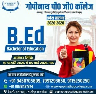 गाजीपुर। गोपीनाथ पीजी कालेज देवली सलामतपुर के प्रबंधक शिवम त्रिपाठी ने बताया कि उत्तर प्रदेश बी.एड. प्रवेश 2026 की महत्वपूर्ण तिथियों की घोषणा बुंदेलखंड विश्वविद्यालय झांसी द्वारा आधिकारिक तौर पर कर दी गई है, जो उत्तर प्रदेश बी.एड. जेईई परीक्षा 2026 का आयोजन करता है। उत्तर प्रदेश बी.एड. जेईई के लिए ऑनलाइन पंजीकरण 10 फरवरी, 2026 से शुरू हो गया है। आवेदन करने के लिए आपके पास 05 मार्च, 2026 तक का समय है, जबकि विलंब शुल्क के साथ 10 मार्च तक आवेदन कर सकते हैं। बैचलर ऑफ एजुकेशन (बी.एड) एक ऐसा महत्वपूर्ण पेशेवर कोर्स है जो आपको शिक्षक बनने और अपने शिक्षक बनने के सपनों को साकार करने में मदद करता है। भारत के सबसे बड़े राज्यों में से एक, उत्तर प्रदेश में कई शीर्ष बी.एड कॉलेज हैं, जहाँ हर साल लाखों छात्र दाखिला लेते हैं। उत्तर प्रदेश में बी.एड. में प्रवेश 2026 पूरी तरह से बुंदेलखंड विश्वविद्यालय झांसी द्वारा आयोजित यूपी बी.एड. जेईई प्रवेश परीक्षा के माध्यम से होता है। यह परीक्षा उत्तर प्रदेश के सरकारी और निजी बी.एड. कॉलेजों में 25 लाख से अधिक सीटों के लिए प्रवेश का एकमात्र माध्यम है—इस परीक्षा के बिना कोई सीधा प्रवेश नहीं होगा। जो छात्र इस साल ग्रेजुएशन या पोस्ट ग्रेजुएशन के अन्तिम वर्ष में हैं वह छात्र भी आवेदन कर सकते हैं।