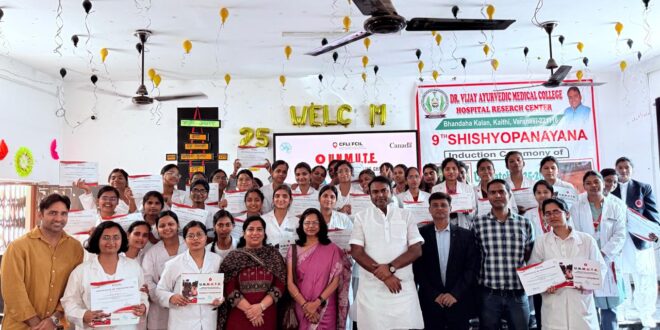 वाराणसी! डॉ. विजय आयुर्वेदिक मेडिकल कॉलेज अस्पताल एवं अनुसंधान केन्द्र, भंदहा कला, कैथी में मंगलवार को छात्राओं हेतु आयोजित U.N.M.U.T.E. (Uplifting Narratives through Media, Understanding, Technology & Expression) व्याख्यानमाला का समापन समारोह सम्पन्न हुआ। कार्यक्रम का शुभारम्भ कृष्ण सुदामा ग्रुप ऑफ इंस्टीट्यूशंस गाज़ीपुर, वाराणसी के अध्यक्ष डॉ. विजय यादव द्वारा भगवान धन्वन्तरी की प्रतिमा पर माल्यार्पण एवं दीप प्रज्वलन के साथ किया गया।यह कार्यक्रम CFLI/FCIL (Canada Fund for Local Initiatives) के सहयोग से तथा High Commission of Canada के तत्वावधान में विगत तीन माह से संचालित किया जा रहा था। पांच दिवसीय, बीस सत्रीय इस प्रशिक्षण कार्यक्रम में कुल 50 छात्राओं ने मास्टर ट्रेनर बनने हेतु सहभागिता की।समारोह के मुख्य अतिथि विदुष सक्सेना (ए.सी.पी., साइबर क्राइम, सारनाथ डिवीजन) ने “साइबर फ्रॉड” विषय पर व्याख्यान देते हुए छात्राओं को ऑनलाइन ठगी से बचाव के उपाय बताए। कार्यक्रम की अध्यक्षता प्रधानाचार्य प्रो. (डॉ.) प्रकाश राज सिंह ने की। समापन अवसर पर प्रतिभागियों को प्रमाण-पत्र, बुकलेट एवं टूलकिट वितरित किए गए। संस्थान के शिक्षकगणों एवं छात्राओं की सक्रिय सहभागिता से कार्यक्रम सफलतापूर्वक सम्पन्न हुआ।